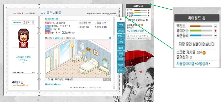 댓글 수나 시간 정보와 같은 정량 피드백 외에도 이미지와 상징 기반의 정성적 상태 변화 피드백도 널리 활용되고 있다. 초기 SNS <싸이월드(Cyworld)>는 사용자 정체성 상징을 위해 페이머스, 액티브, 카르마, 에로틱, 프렌들리, 카인드 등 지표 항목을 개발했다. 각 정체성은 ‘매력지수’라는 명칭의 프로그래스 바를 통해 달성도를 공개하면서 질적, 양적 피드백 기능을 수행했다.