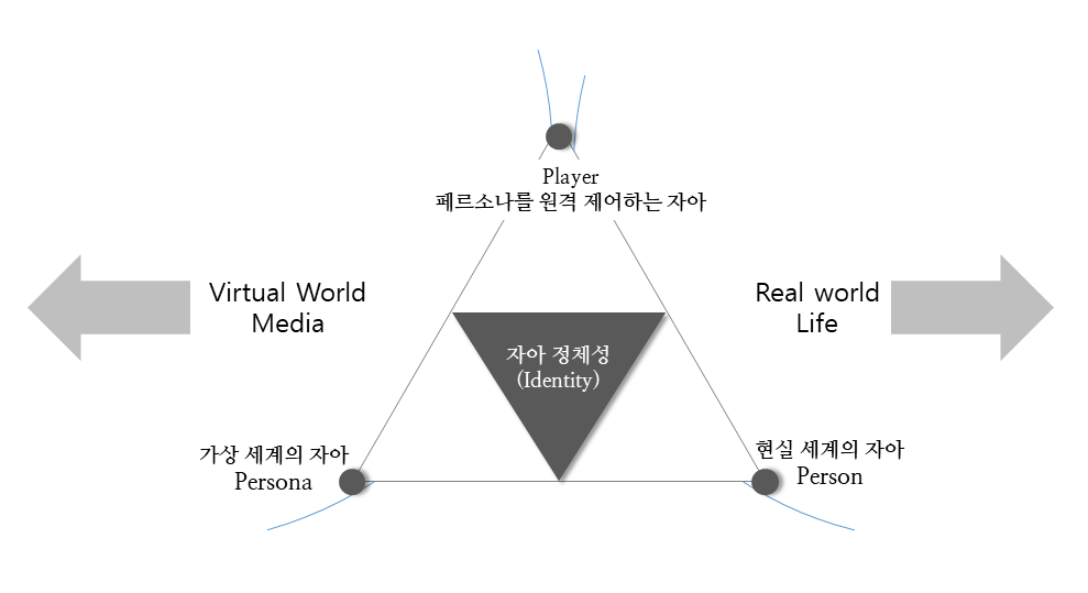 ① 페르소나 (Persona): 자아가 가상 세계에 적응하기 위해 선택한 행동과 인지 양식이다. 가상 세계 고유의 맥락, 관습, 상징이 존재하고 이것은 현실에서 통용되는 것들과 상이할 수 있다. 페르소나는 현실 자아와 동일성을 추구할 수도, 전혀 다른 방향을 향하는 것도 가능하다. 새로운 정체성 형성에는 자유로운 상상과 일탈 욕망, 억압에의 저항과 같은 힘이 작용한다.