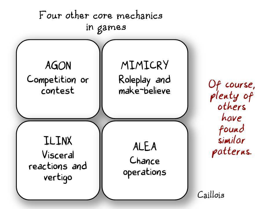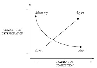 까이와에 따르면 대결, 우연, 모의, 현기증은 게임에 임하는 놀이꾼이 목적 달성을 위해 서로 다른 역할을 수행한다. 그리고 이중 무엇이 특정 게임에서 지배적 지위를 갖는가에 따라 아곤(Agôn), 알레아(Alea), 미미크리(Mimicry), 일링크스(Ilinx)의 고유한 특질을 지닌 게임을 경험하게 된다는 것이다.