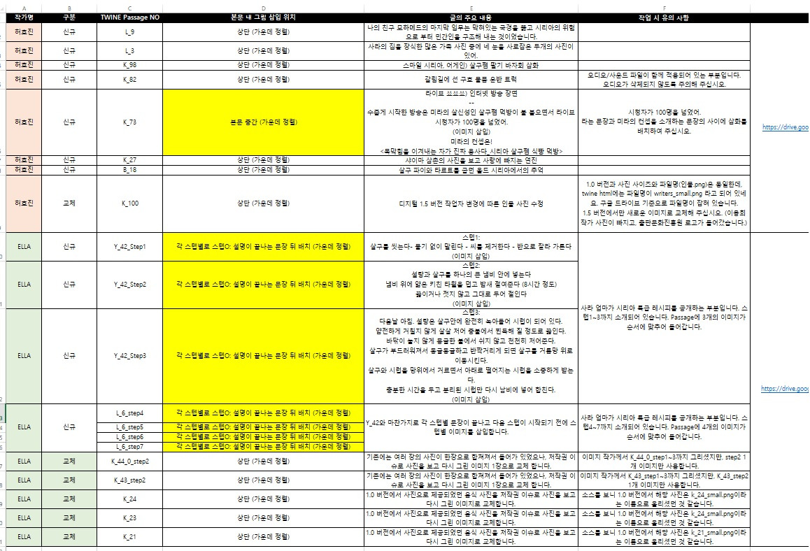 작업을 하면서 당연한 일이지만, 모든 스크립트를 리스트업 해서 경로를 확인하고 대사를 점검하는 협업은 시간이 참 많이 걸리는 일이었습니다. 1.0 작업을 통해 사실상 완성고가 있었음에도 불구하고 퇴고란 것이 정말 어려운 일이라는 것을 이번에 깨닫게 되었죠. 양심적으로 말하자면, 아직 퇴고가 다 되었다고 보기 어렵습니다.