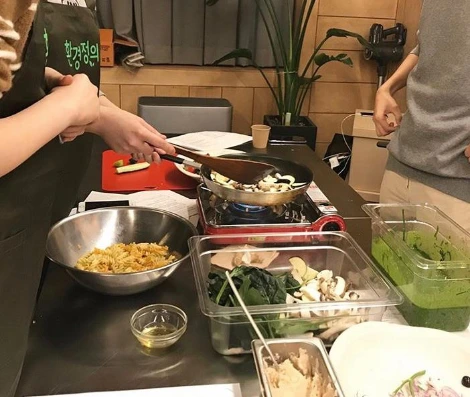 비건 소스는 한번 만들어두면 꽤 오랜 기간 동안 간편하게 활용하기에 좋다. 리필 마켓에 몇 번 참여한 뒤, 이런 강점을 알아본 한 환경 단체 쪽에서 우리에게 ‘소스를 활용해 간단한 비건 음식 만들기’ 워크숍 진행을 의뢰했다. 요리 워크숍을 진행해보는 건 또 둘 다 완전 처음이었는데, 대상이 ‘거의 요리를 안 해 먹는 만 24세 미만 자취생’이었기 때문에 조금 더 편하게, 소소한 팁들을 공유한단 마음으로 했다. 믹서기를 활용해 비건 소스 만들어 두는 법, 소스를 활용해 간단하게 비건 파스타와 볶음밥을 만드는 법을 알려주었는데, 워크숍 이후 정말로 레시피를 활용해 요리를 해 먹고 우리를 태그해 인증해주는 참여자가 많았다. 또 다른 결의 뿌듯함을 느끼는 계기였고, 그 경험을 통해 우리는 “요리 워크숍을 진행할 수도 있구나''라는, 또 하나의 일 근육이 생겼다.