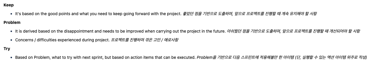 나는 전통적인 회고 방법론인 KPT를 기반으로 좋았던 점, 문제였거나 부족했던 점, 부족했던 점을 개선하기 위해 시도할 수 있는 것들에 대해 생각해오라고 가이드 했다. 우리는 이를 통해 아쉬웠던 부분을 바로잡고 프로젝트가 좋은 방향으로 발전할 수 있도록 개선할 수 있다.
