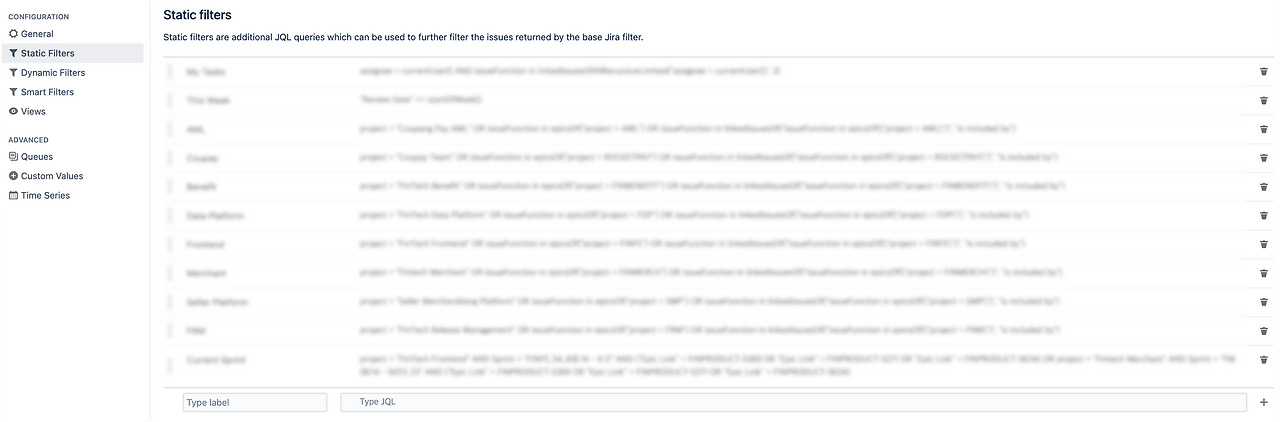 - 정적 필터는 기본 Jira 필터에서 반환된 문제를 추가로 필터링하는 데 사용할 수 있는 추가 JQL 쿼리이다.