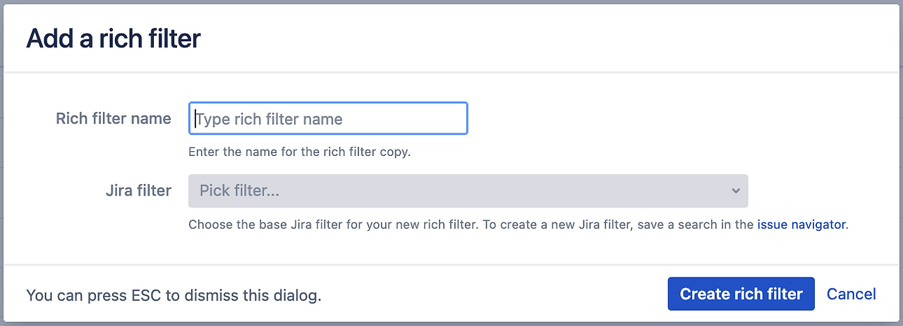 - Jira filter: 리치 필터로 생성하고자 하는 Jira 필터를 불러오면 된다. 다른 사람이 만든 필터도 공유되어 있다면 불러올 수 있다.