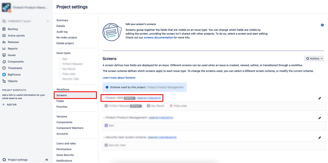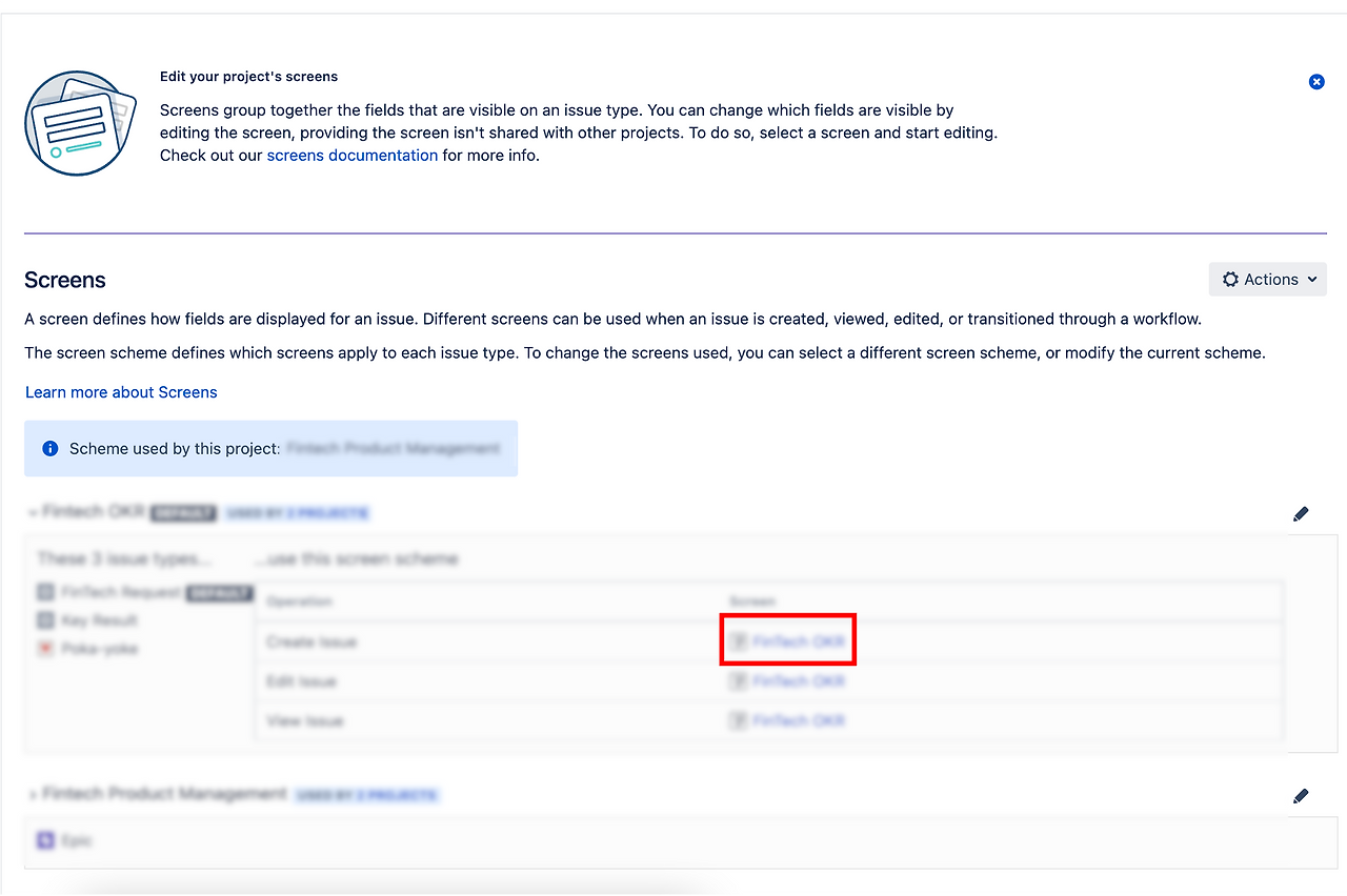 3. 펼쳐진 스크린 스킴 중 Create Issue에 적용된 스킴을 클릭한다.