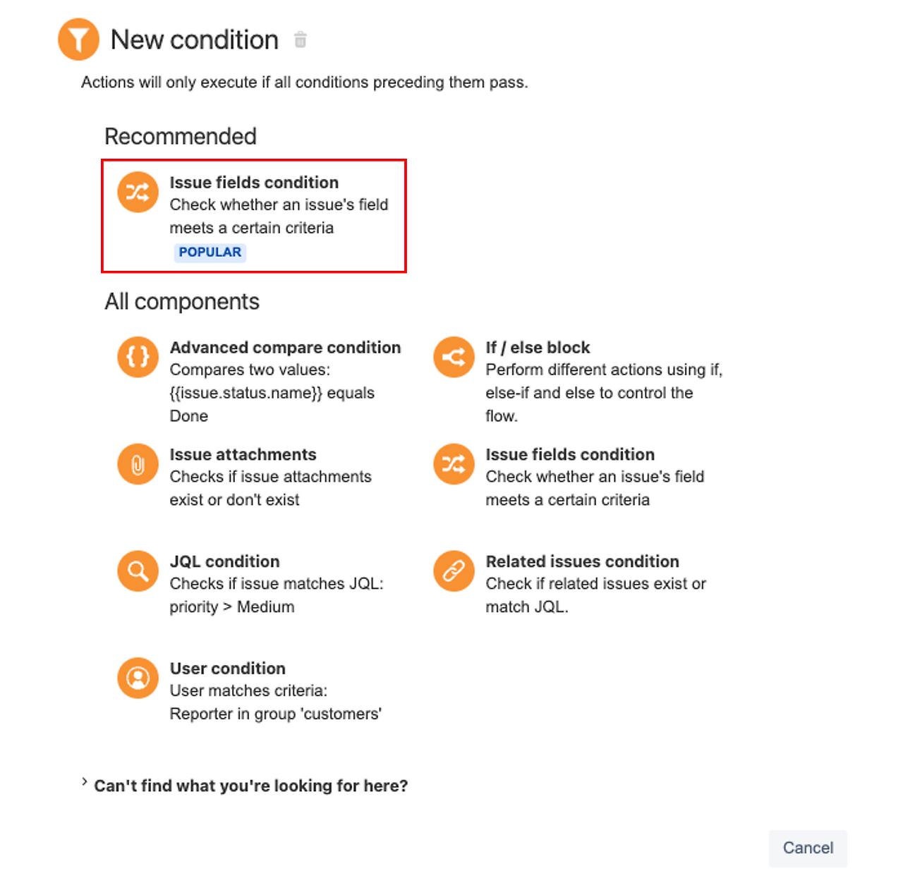 이슈 타입에 관한 컨디션을 만들어야 하므로 Issue fields condition을 선택한다.