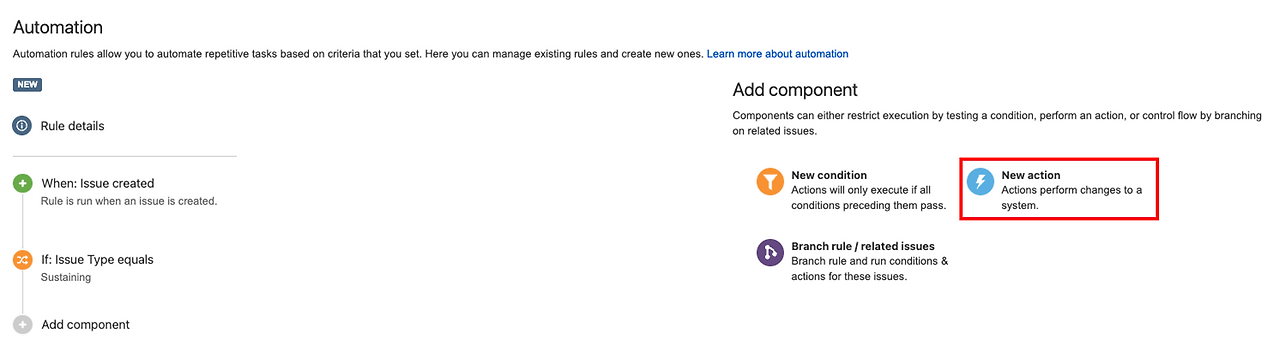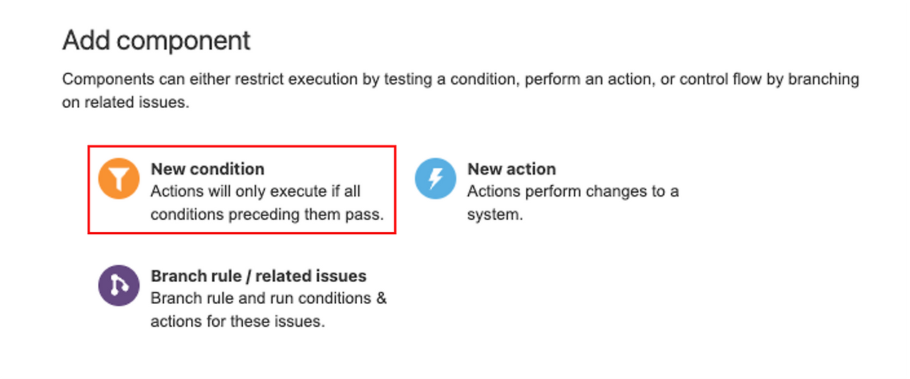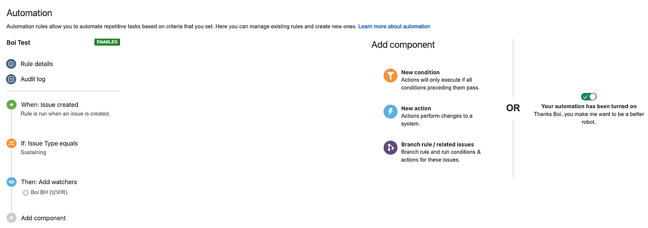 Issue type이 sustaining인 경우에만 자동화가 실행되는 것이므로, 특정 조건에만 실행될 수 있도록 컨디션을 만들어야 한다.