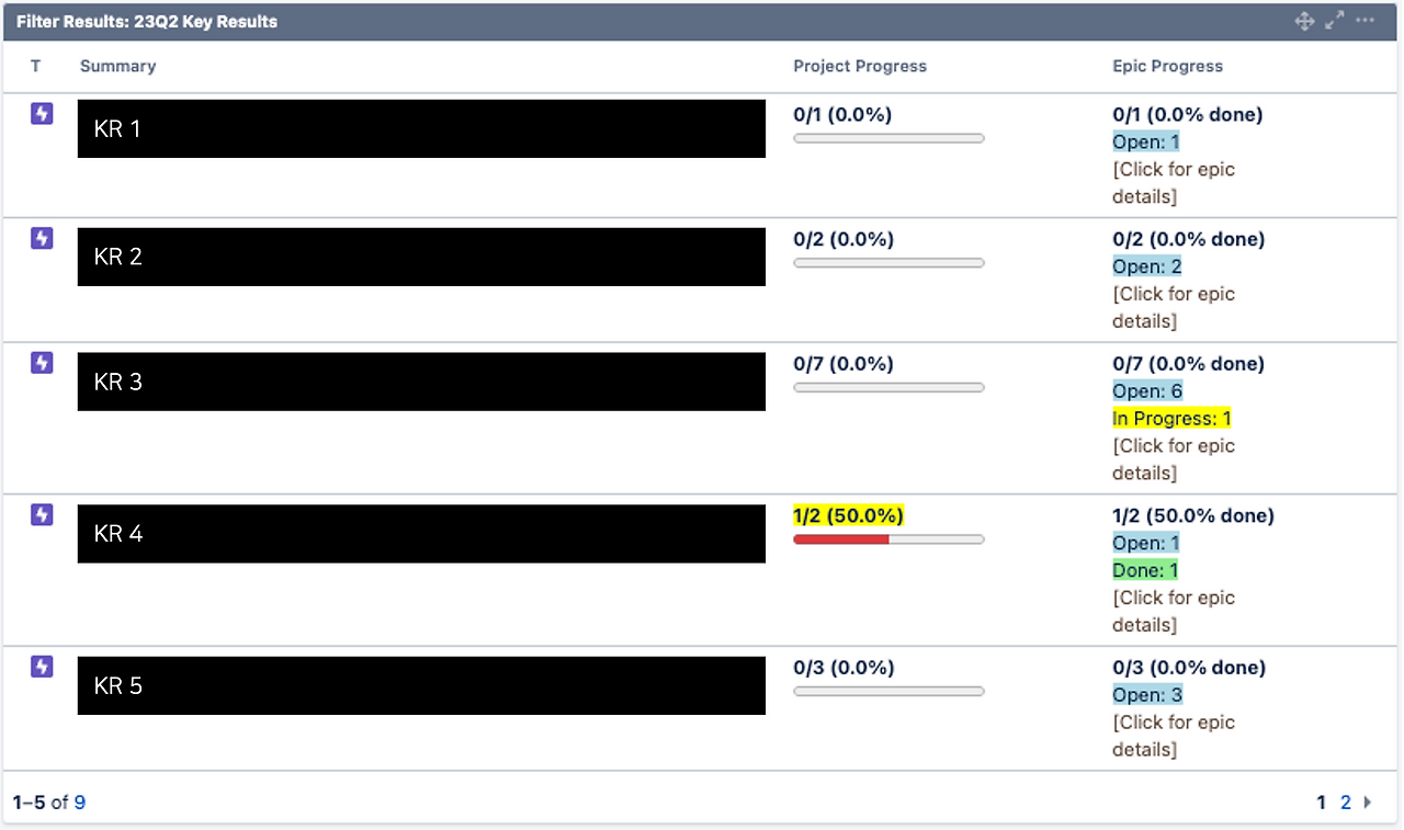 필터 : project = "KR 티켓이 생성된 프로젝트" AND type = "Key Result"