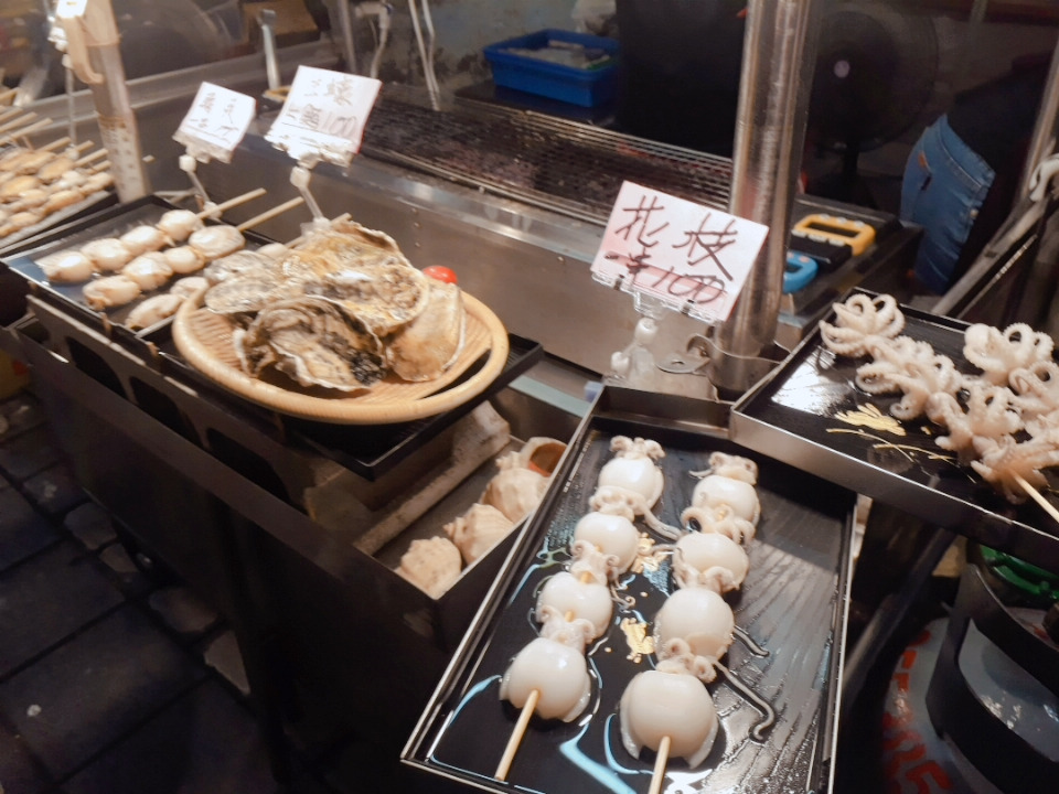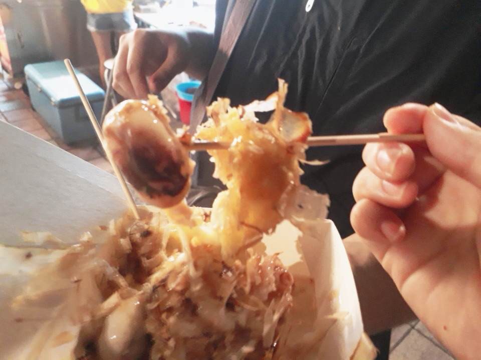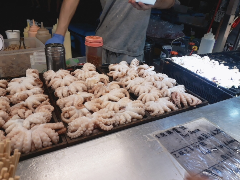 야시장에서 가장 처음으로 먹어본 음식. 타코야끼 반죽에 주꾸미를 얹은 음식이다. 예상 그대로 고급진 타코야키 맛이었다.