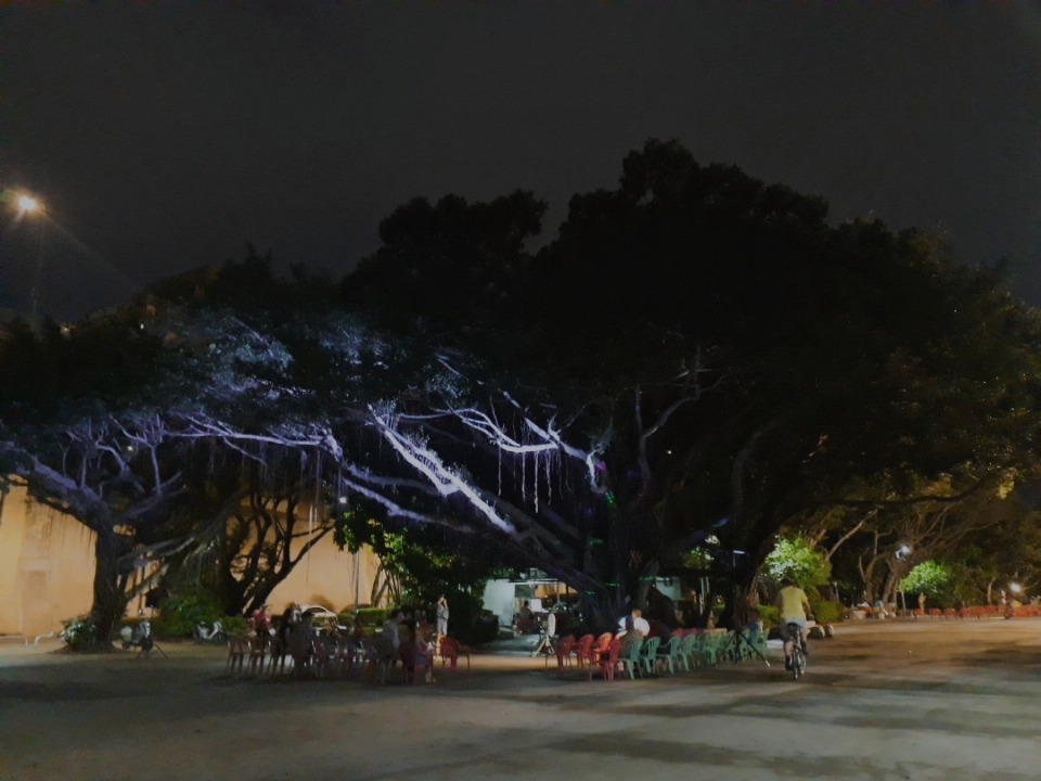 박스스토어로 들어가는 길(왼쪽). 큰 나무 밑에서 가수가 노래를 부르고, 몇몇 관객이 의자에 앉아 노래를 듣고 있었다.