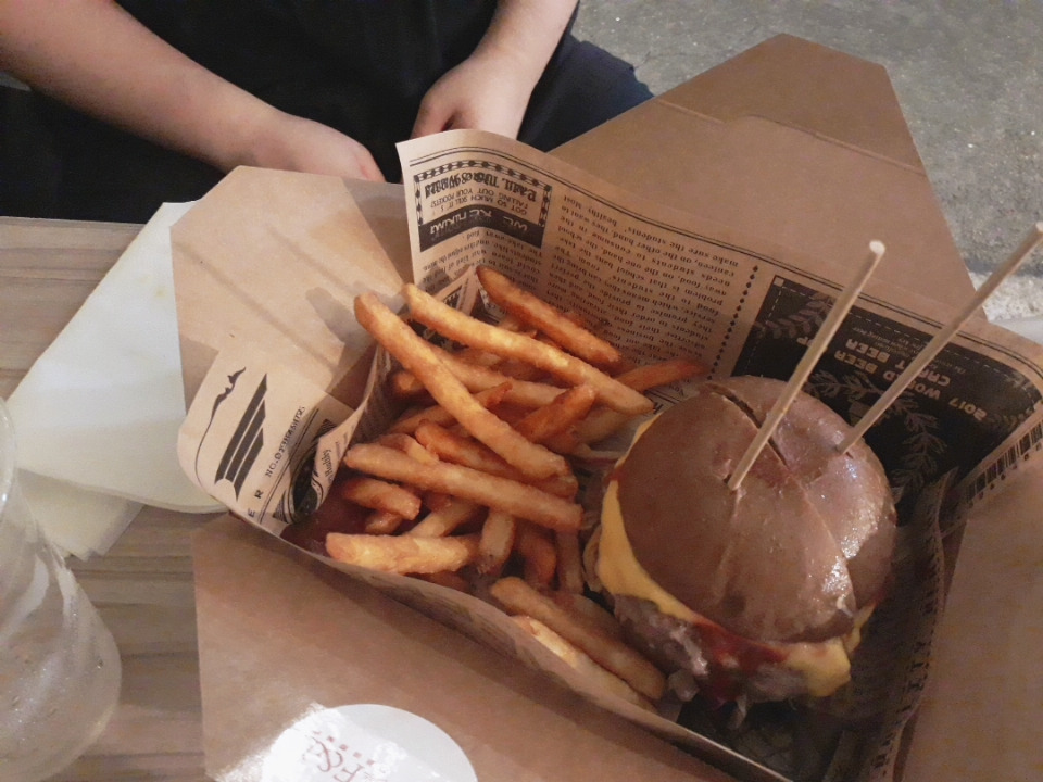 내가 먹은 건 양고기와 감자튀김 버거 세트, 그리고 타이완 비어였다.