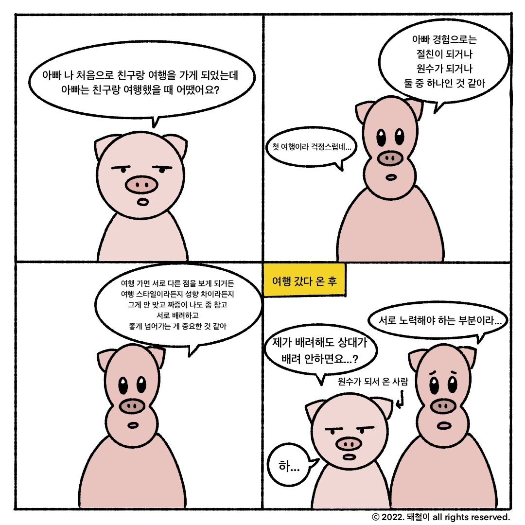 아빠는 여행 스타일(잠은 어디서 자는지, 밥은 뭘 먹는지, 어디 위주로 가는지)과 성향에 따라서 많이 싸운다고 하셨다