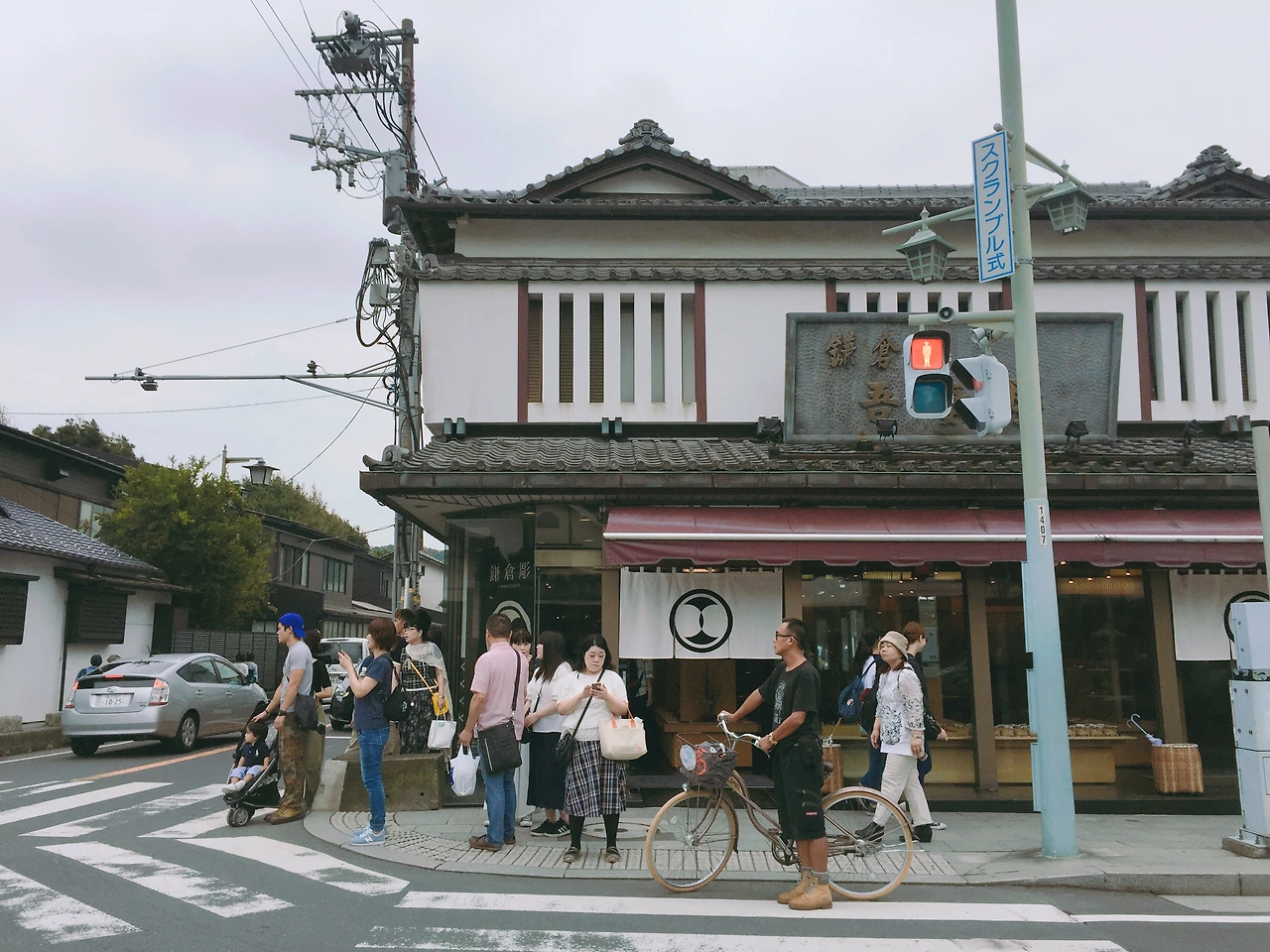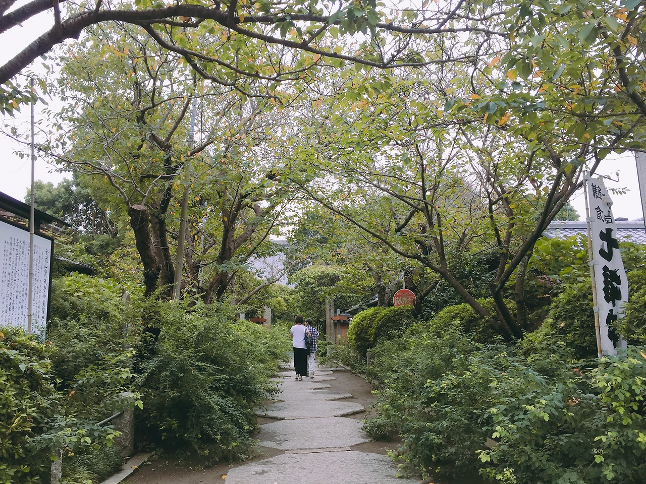 대기 명단에 이름을 올리고 다시 Inamuragasaki 역으로 돌아가 몇 정거장 더 가서 가마쿠라역에 내렸다. 사람이 엄청 많다. 역에서 나와서 조금만 걸어가면 메인 스트리트가 나오는데 거리가 사람으로 꽉꽉 차있었다. 배가 무척 고팠고 밥을 먹으려면 아직 한시간이 넘게 남아있었기 때문에 간단한 군것질로 허기를 달래기로 했다. 나의 첫 선택은 붕어빵. 작은 붕어빵 여덟개에 한화로 5천원 정도 했던 것 같은데 다양한 맛이 있어서 원하는 걸 고르면 된다. 플레인, 단팥, 초코, 치즈, 머스터드 맛을 골랐다. 맛있었다! 같이 간 현지 친구가 가마쿠라는 소시지, 가마쿠라 맥주, 멸치덮밥류의 해산물 등이 유명하다고 했다. 길거리에서 소시지 한컵, 맥주 한잔 사서 먹거나 녹차 아이스크림을 먹으며 구경을 하면 꿀맛일 것 같다. 맛있는 식사를 위해 배부른 음식은 자제했고 중간에 아이스 녹차라떼를 하나 더 사먹었다. 거리에는 작은 기념품 가게들, 음식점들이 빼곡히 들어차 있었다. 주로 먹는 곳이 많았던 것 같다. 말랑말랑한 비누를 파는 가게에서 비누를 직접 써볼 수 있게 세면대를 마련해둬서 붕어빵 기름 묻은 손을 깨끗하게 닦았다. 비누가 말랑말랑하고 부드러운게 기분이 너무 좋아서 하마터면 살 뻔했다. 비싸니까 자제하고 대신 기념품 가게에서 귀여운 단고 모형을 두개 사서 같이 간 친구와 나눠 가졌다. 악세서리, 유리 공예품 등 아기자기한 소품을 파는 곳에서는 다른 친구에게 줄 판다 스티커를 샀다. 어디 놀러가면 작고 귀엽고 그리 비싸지 않은 물건을 쉽게 사는 편인데, 이런 나를 두고 언니는 예쁜 쓰레기(!)를 사지 말라고 말리지만 막상 때가 되면 멈출 수가 없다. 거리를 통과해 Houkokuji라는 이름의 근처 절까지 걸어갔다. 넉넉잡고 한 20분 가량 걸어간 것 같은데 시간이 없거나 날씨가 좋지 않으면 버스를 이용해도 좋을 것 같다.