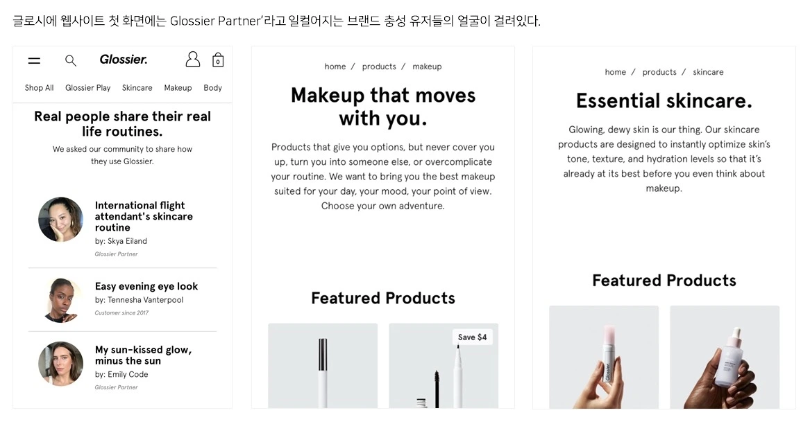 첫째, 그들은 명확한 타켓 오디언스를 상정한다. 여기서 중요한 것은 브랜드가 제품 구매자들을 단순히 ‘소비자’로 정의하지 않고 ‘오디언스’로 정의한다는 데 있다. ‘소비자’에게는 ‘광고’를 하고 ‘물건’을 팔면 되지만, ‘오디언스’에게는 ‘메시지’를 가지고 ‘말을 걸어야’ 한다. 뷰티 브랜드 글로시에는 2030 밀레니얼 여성들에게 ‘메이크업으로 다른 사람이 되려고 할 필요 없어요. 당신의 본래의 피부에 집중하세요.’라고 말한다. 그들의 웹사이트 첫 화면에는 화려한 메이크업을 한 연예인이나 물광 피부를 자랑하는 뷰티 인플루언서의 얼굴이 보이지 않는다. 대신 거의 생얼에 가까운 일반인 여성들의 얼굴이 걸려있다.