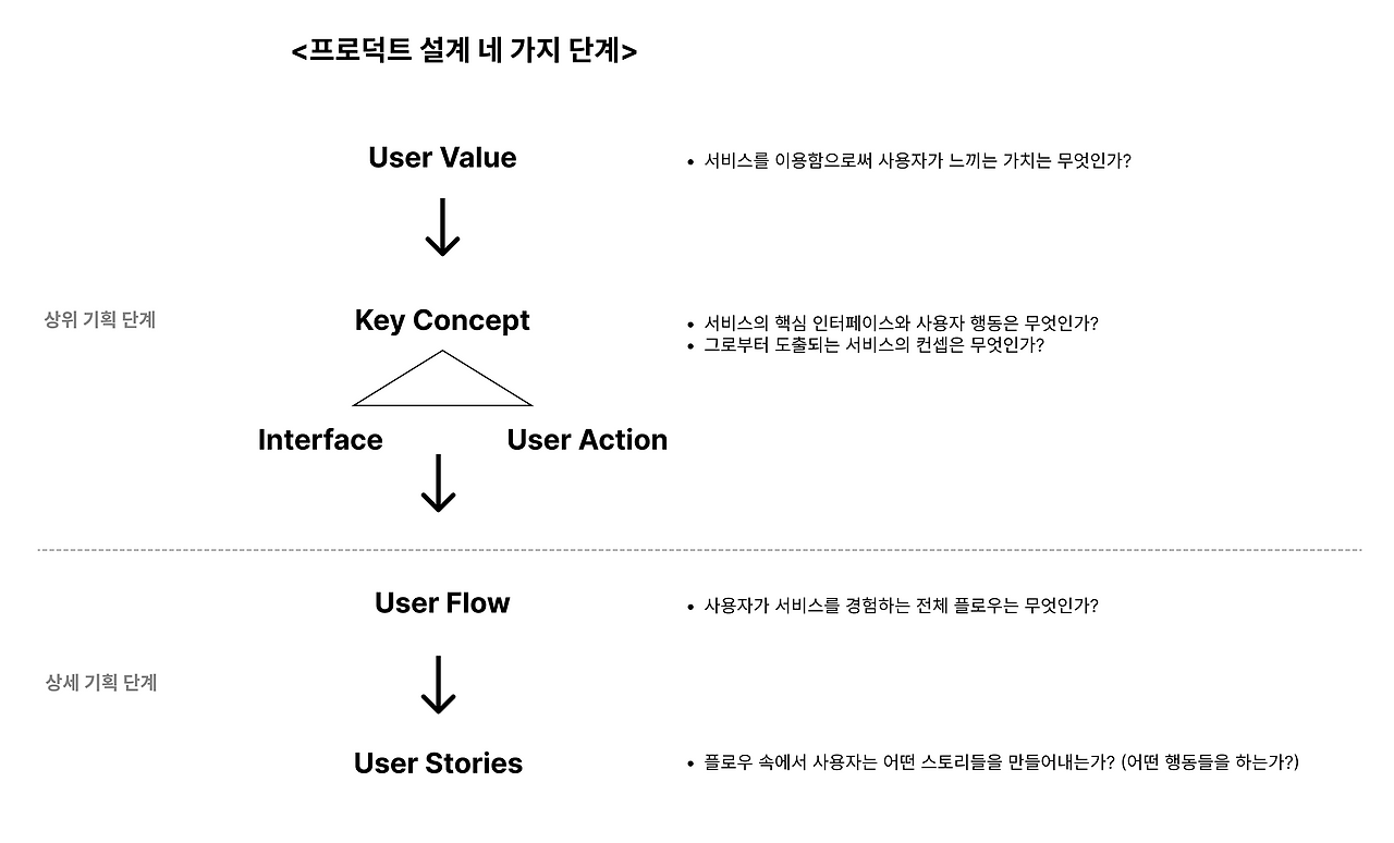 IT 서비스 기획자로 10년 넘게 일하면서 많은 경험을 쌓아왔다. 비록 아주 작은 기능일지라도, 머릿속의 아이디어가 눈에 보이는 형태로 구현되는 재미를 알아가며 신입 시절을 보냈고, 프로덕트를 설계하고 개발자나 디자이너와 협업하는 기본 역량을 다지며 주니어로 성장했다. 기획자로 일한 지 만 5년 정도 되었을 때 화면 없이 음성으로 조작하는 하드웨어의 도메인 서비스 기획에 도전했다. 그동안 해오던 방식이 아닌 전혀 새로운 방식의 기획을 고민해야 했고, 기획을 하고 동료들과 리뷰하는 과정에서 명확하고 정교한 커뮤니케이션을 하기 위해서는 체계적인 프레임이 필요하다는 사실을 깨달았다. 하지만 이 새로운 도전은 시장과 회사 상황의 변화로 약 1년 만에 마무리되었고, 이후 신규 사업팀에서 새로운 서비스를 출시하는 일을 하게 됐다. 사용자 가치와 핵심 컨셉을 깊이 고민하는 데 많은 시간을 쏟았고, 이 무렵 내가 만들고 싶은 서비스도 처음으로 생겼다. 우연히 좋은 멤버들을 만나 사이드 프로젝트 형태로 내가 만들고 싶은 서비스를 실제로 출시하고 기대보다 좋은 성과를 거두기도 했다. 하지만 좋은 것과 나쁜 것이 항상 함께 있듯이, 마음껏 꿈을 펼쳐 작은 성공을 거둔 이 경험은 부작용도 있었다. 회사에서 리더십이 제시하는 비전에 공감하기보다는 '이렇게 하면 좋을 텐데, 저렇게 하면 좋을 텐데'하는 불만스러운 마음이 점점 커진 것이다. 결국 좀 더 작고 빠르게 움직이며 내가 주도적인 역할을 할 수 있는 조직을 찾아 회사를 떠났다. 이후 2년간은 다이나믹한 시간의 연속이었다. 바깥으로는 관심사가 '서비스'에서 '조직' '리더십' '팀' '창업'등으로 넓게 확장되었고, 안으로는 '내가 진짜 원하는 것'이 무엇인지 좁혀졌다. 지금 시점에 내가 원하는 것을 요약하면 크게 세 가지다. 1. 리더십의 비전에 대한 공감 2. 역량 있는 팀원들과 팀플레이 3. 어느 정도의 안정감. 이후 내 커리어가 어떤 방향으로 흘러갈지 아직 확신할 수 없지만 일단 내가 원하는 것을 명확히 알았다는 것은 좋은 신호다. 이전보다는 조금은 더 넓은 시야로 판단하고, 쉽게 들뜨거나 지치지 않고, 이전엔 보지 못했던 작은 즐거움들을 더 잘 찾아내며 일할 수 있을 것 같은 기대가 있다. 여기까지가 그동안의 커리어에 대한 소회였다. 지금부터는 내가 스스로 정의해 본 프로덕트 설계의 네 가지 단계에 대해 소개해 보겠다.