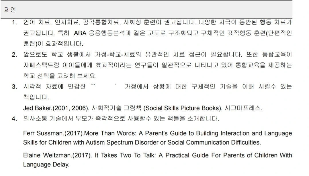 위 아이는 자폐성 진단을 받았고 검사자는 ABA응용행동분석과 구체적인 표적행동훈련(단편적인 훈련)을 제안하였습니다.
