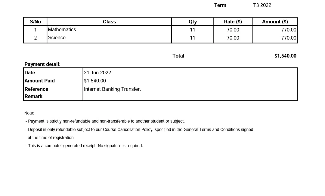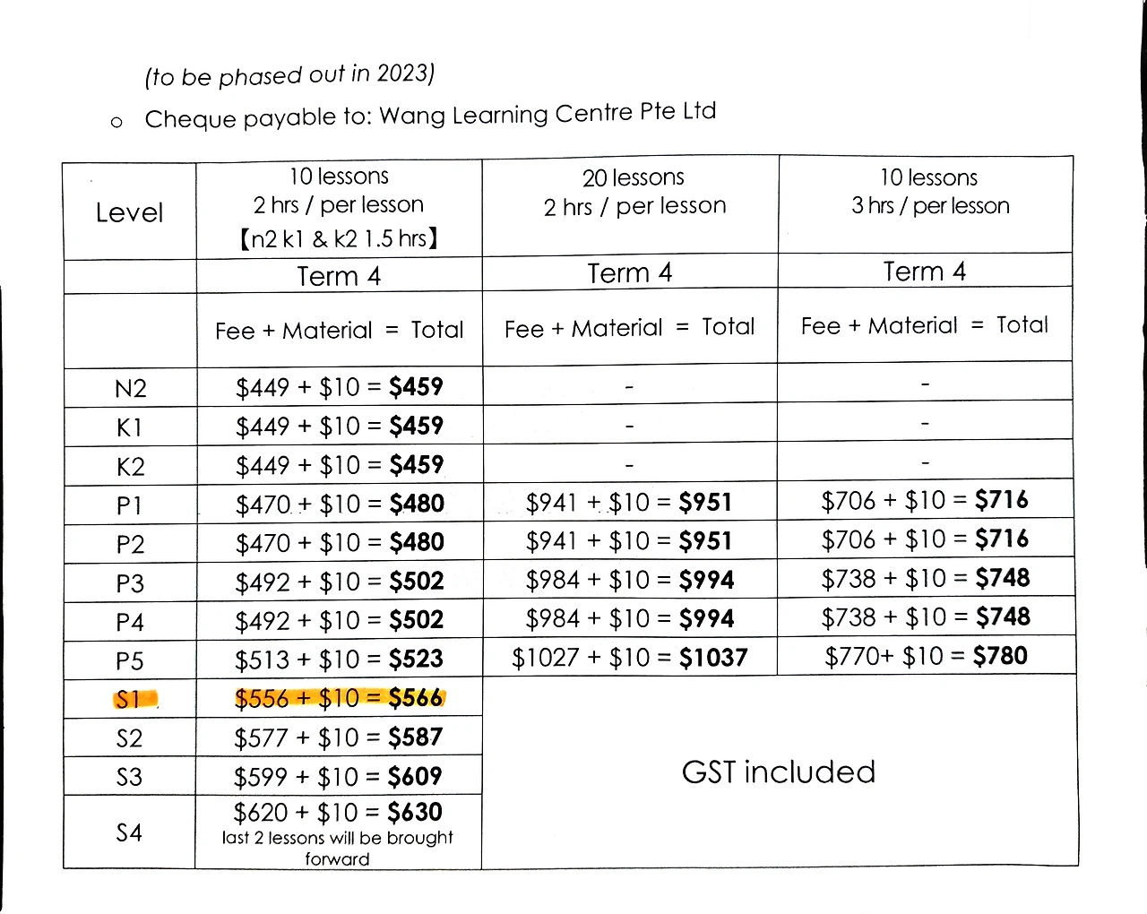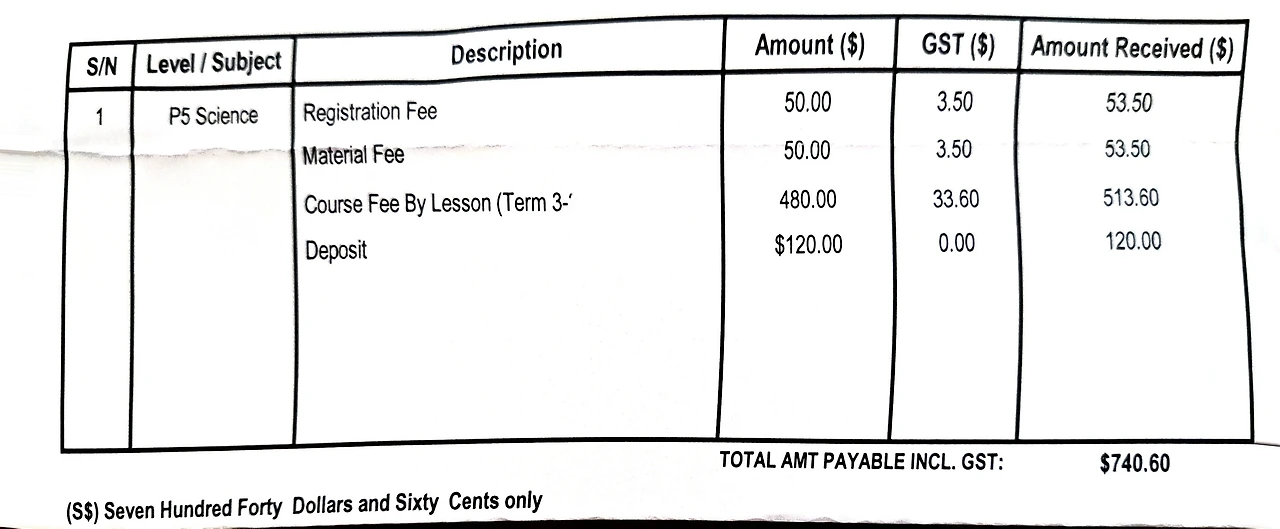 싱가포르의 학원들은 대체로 1주일에 1번의 수업이 있습니다. 그리고 텀(term)별로 학원비를 내는 곳이 대부분입니다.