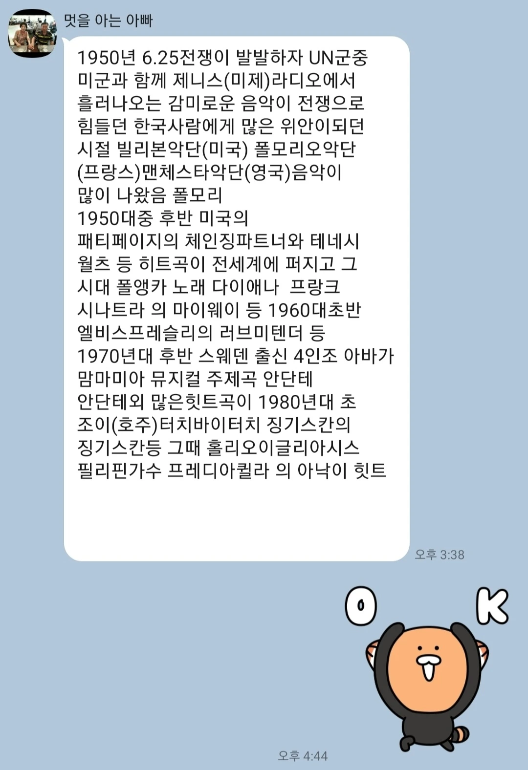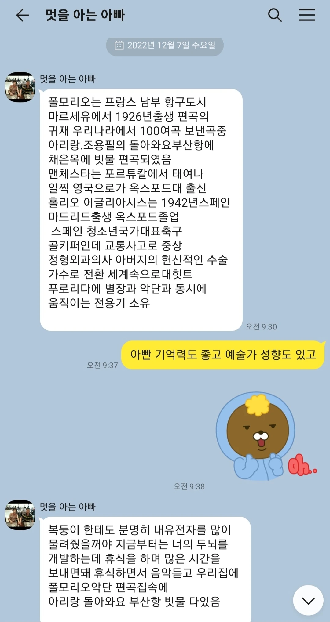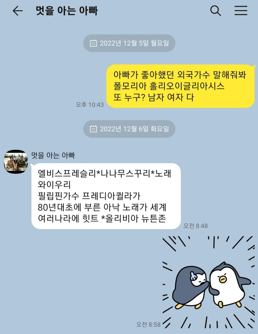 그래서 그 밤 아빠에게 카톡을 보낸 것이다. 아빠가 좋아했던 외국 가수가 누군지 말해달라고. 그랬더니 아침부터 아빠는 내게 카톡을 보내왔다.