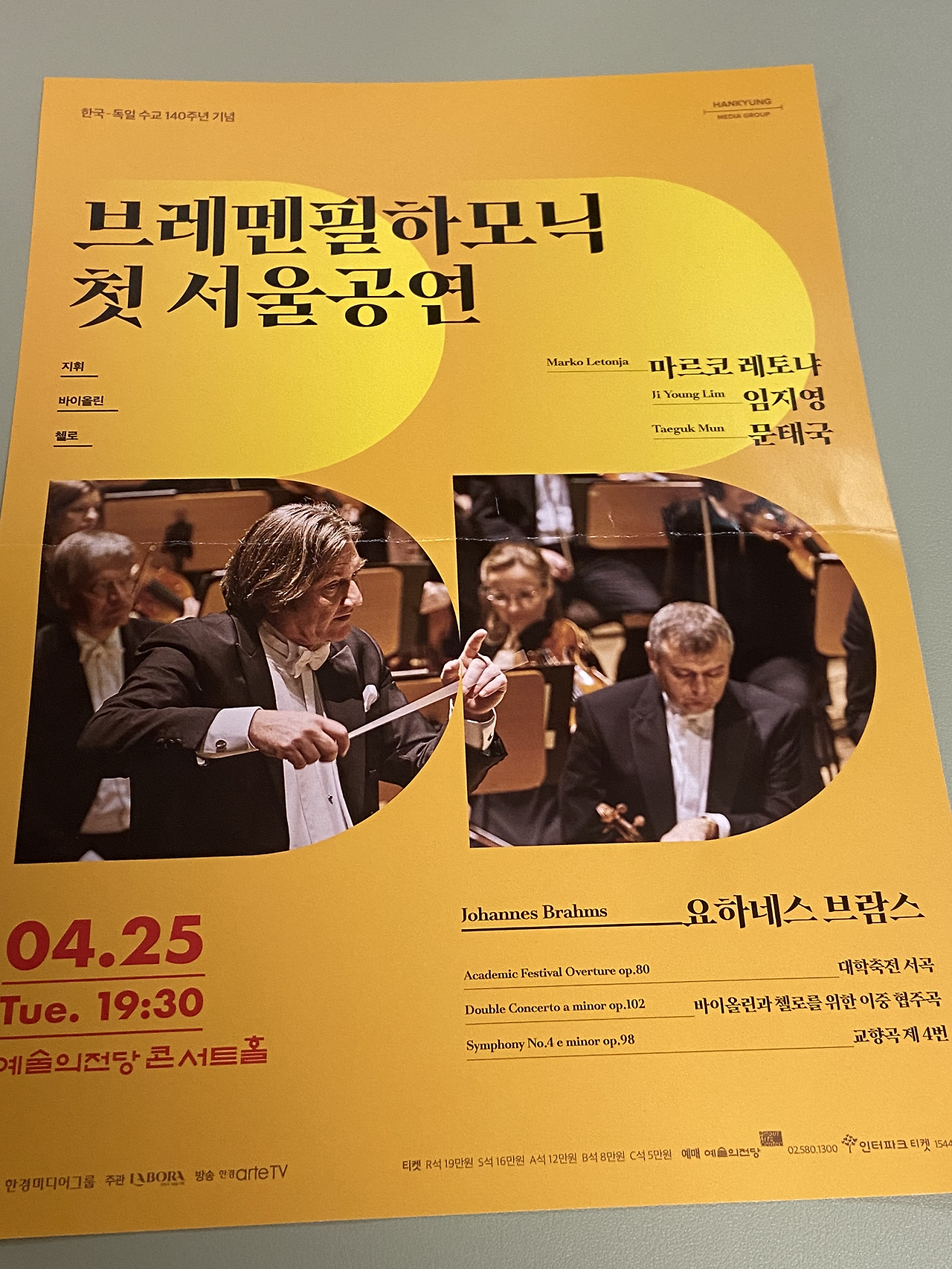 브레멘필하모닉의 첫 서울공연. 사이드이긴 했지만 10번째 줄이었다. 무대가 훤히 잘 보였다. 연주자들이 입장하는데 그들의 표정이 너무 잘 보여서 오히려 낯설었다. 대학로의 작은 소극장이 아니고서야 뮤지컬이나 연극을 앞자리에서 관람한 적은 별로 없었다. 공연은 나의 관심 소비 대상이 아니었다. 누군가 제안하면 동참하는 식이었으니 문화생활보다는 친교활동의 수단에 가까웠다.