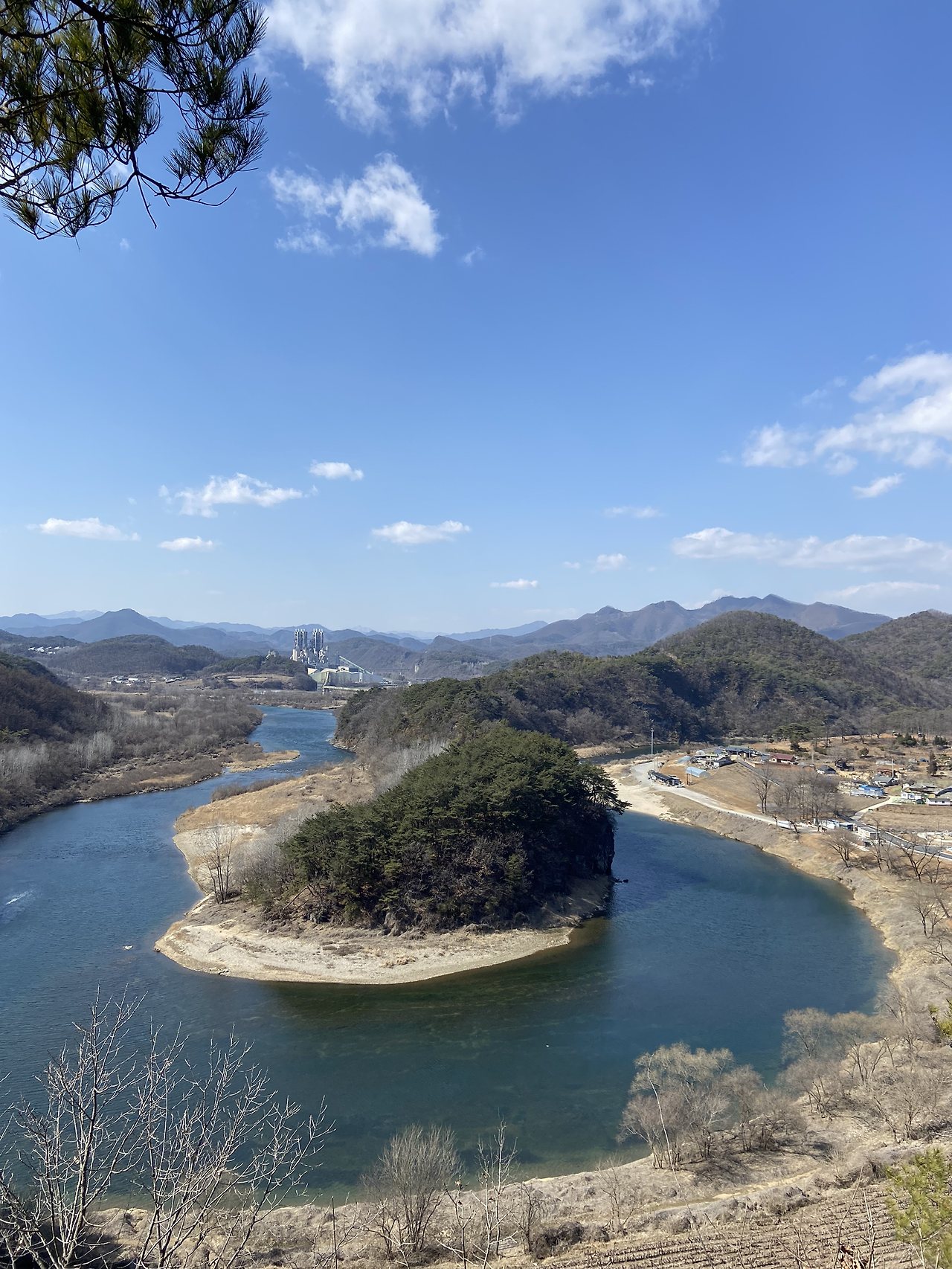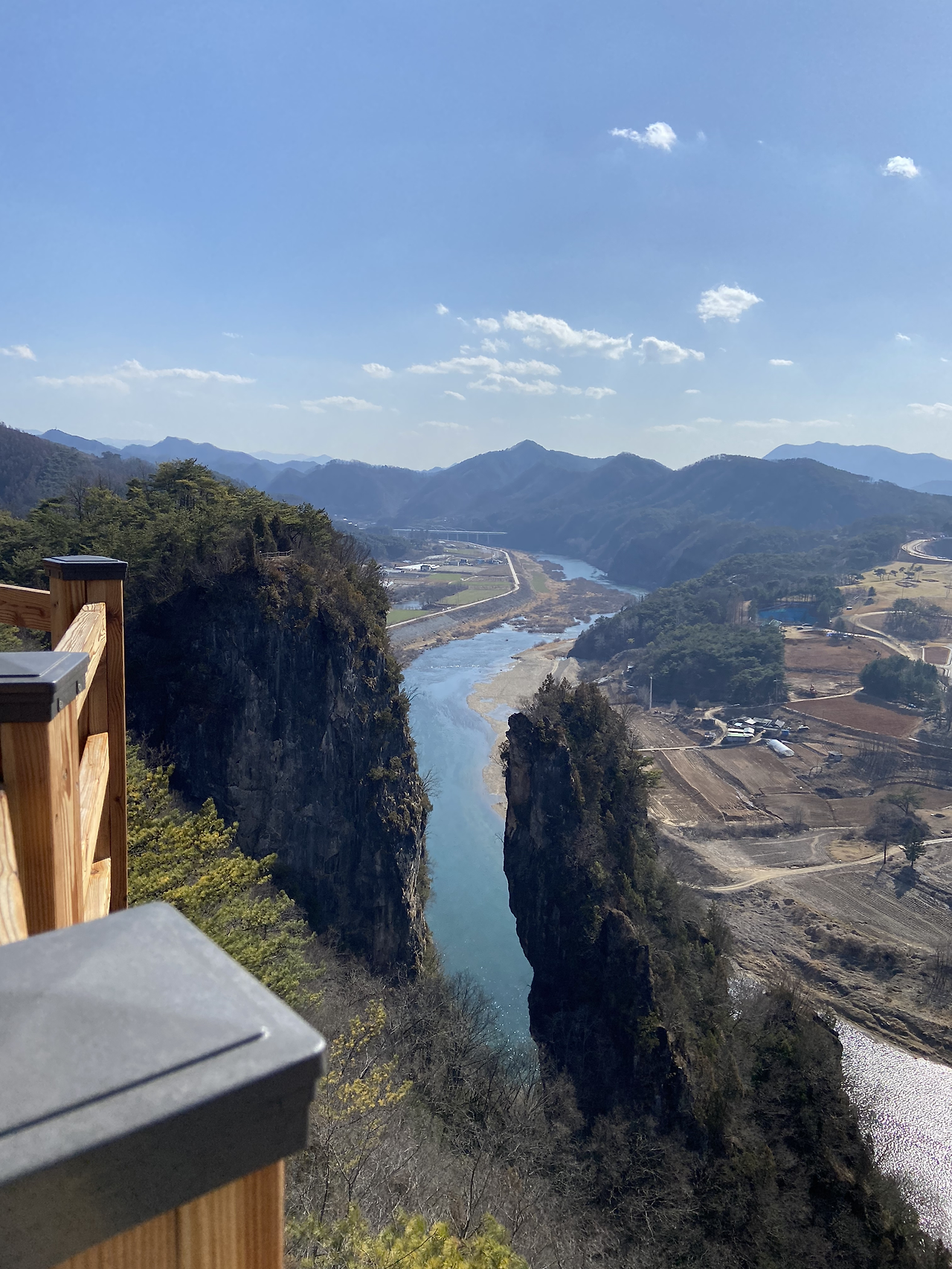 영월에 대해 알지 못했던 나와 달리 남편에게는 처음부터 염두에 둔 목적지들이 있었다. 가장 먼저 '한반도 지형'으로 향했다. 하천의 침식 작용에 의해 생겨난 지형이 마침 한반도 모양을 빼다 박아서 이런 이름이 붙은 거였다. 거북 바위니 용두암이니 하는 것과 같은 방식의 작명이지만 책에서 보던 지도를, 수업하며 칠판에 수백 번은 그렸을 한반도를 탁 트인 전망대에 서서 내려다보니 어쩐지 웅장해지는 기분이었는데 그 정체는 아마도 국뽕이었을 것이다.