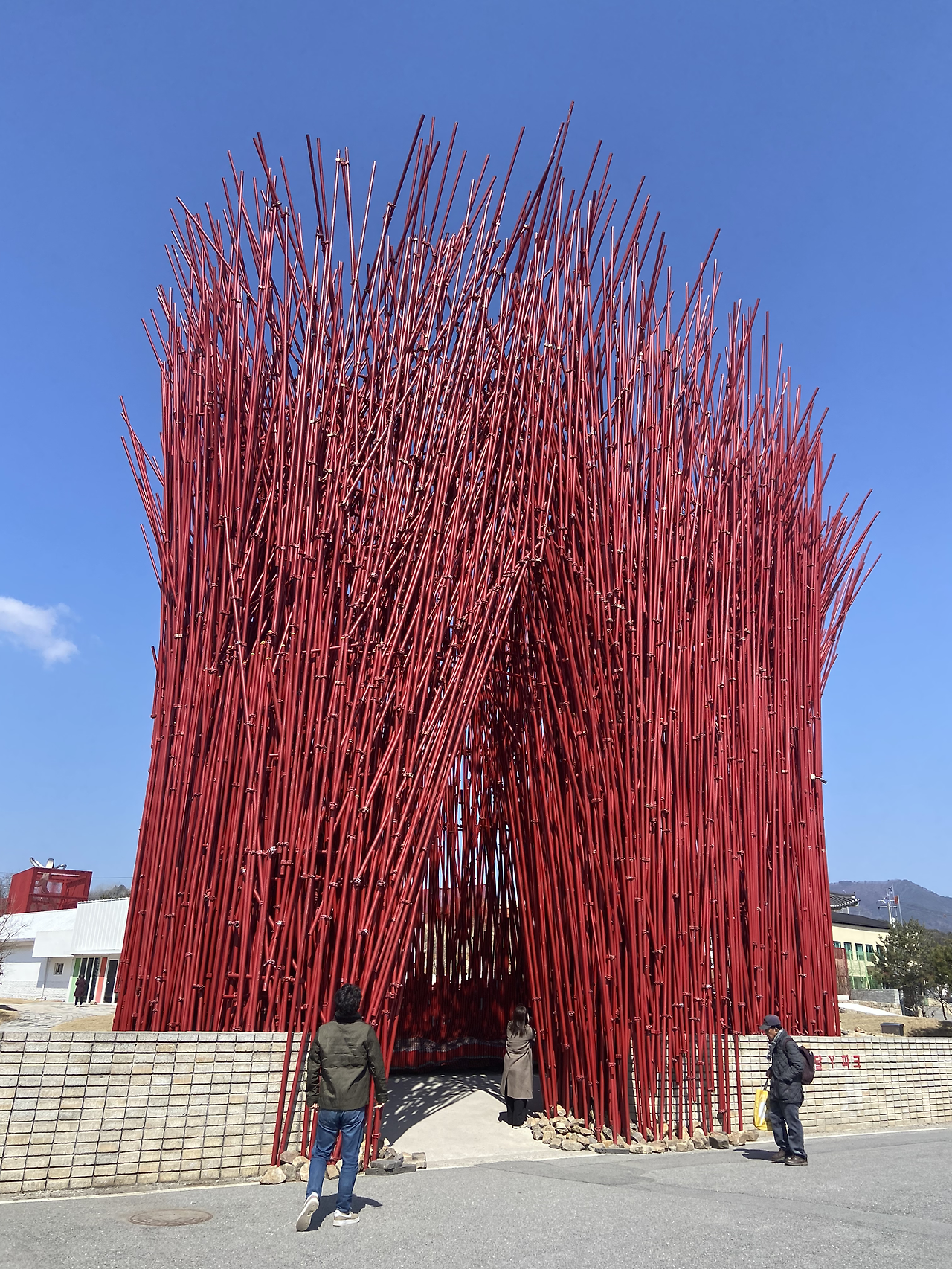 입구부터 시선을 확 잡아끌었다. 마치 대나무처럼 보이는 새빨간 기둥들이 새파란 하늘빛 아래 강렬한 기운을 뿜어냈다. 가까이서 보니 대나무가 아니라 금속 기둥들로 만든 조형물이었다. 나도 모르게 계속 감탄하게 되었다. 가는 곳마다 포토 스팟이었다. 그 순간부터 쉼 없이 사진을 찍어댔던 것 같다. 간단히 검색을 해보니 원래 술샘(=주천) 박물관이 있던 자리를 더욱 확장해서 강릉원주대학교 미술대학 교수인 최옥영이라는 공간디자이너가 기획한 현대 미술 전시관이었다.