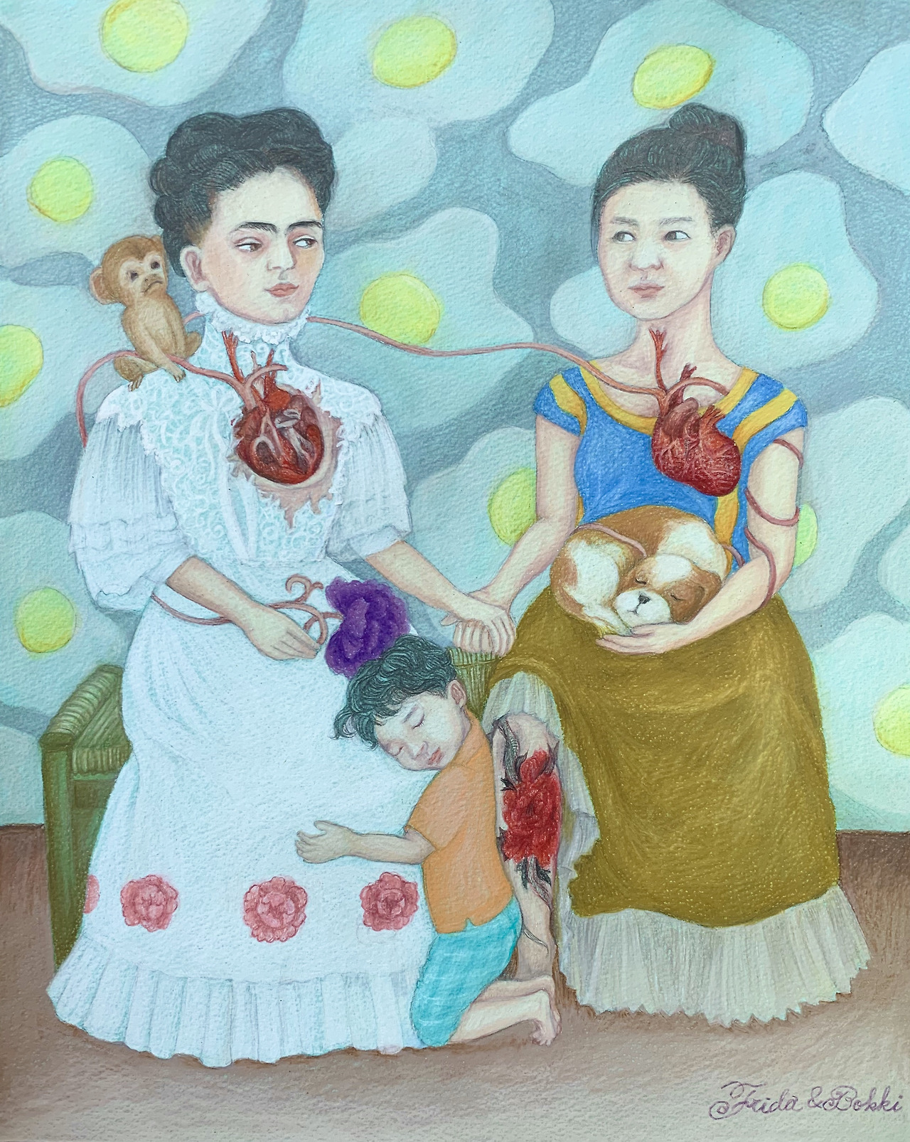 제가 그림을 공부하면서 좋아했고 알게 모르게 영향받은 여성 작가 3 분을 골라서 그들의 작품 스타일을 제 그림속에 녹여보고자 합니다. 세 명의 여성 아티스트만을 추리기가 너무 힘들었습니다만 첫번째 작가로 멕시코의 국민 화가이자 애니메이션 코코와 셀마헤이엑(Salma Hayek)주연의 ‘프리다’(2002)로 알려진 프리다 칼로 Frida Kahlo 입니다. 이분의 생애와 작품은 너무 잘 알려져 따로 언급하지않고 제 작품과의 연관성만을 간략히(?) 적겠습니다. 어렸을적 끔찍한 사고로 겪은 육체적 고통과 아주 개인적인 경험이 그림에 나타나있는데 현실의 고통 못지않게 이를 초월하는 그녀의 아름다운 상상력이 또한 많은 영감을 줍니다. 아주 개인적인 경험과 함께 중앙 아메리카 민속문화에 뿌리를 둔 그녀의 화풍은 한국화/동양화 전공하고 민화의 전통을 계승하고 싶은 제 그림의 지향점과도 일맥상통합니다. 제가 다시 그리기로 꼽은 ‘두명의 프리다’ 라는 작품은 미술사가 역사학자들에 의해 해석이 분분한데 어릴적 교통사고로 인해 몸이 약한 프리다의 두번의 유산의 아픔을 그리고 있다 혹은 스페인과 아메리카 원주민 혼혈인 그녀의 뿌리에 대한 작품이라고 전합니다. 저 또한 어린 시절 사고로 오른쪽 다리 전체에 화상을 입고 상처와 함께 살아가고 있기에 그 때의 프리다 처럼 투사와 같이 생존한 그분들과 시대와 나라를 초월해 많은 사람들에게 영감을 준 그녀에게 바치는 찬사이자 작은 위로로 이 그림을 바칩니다!