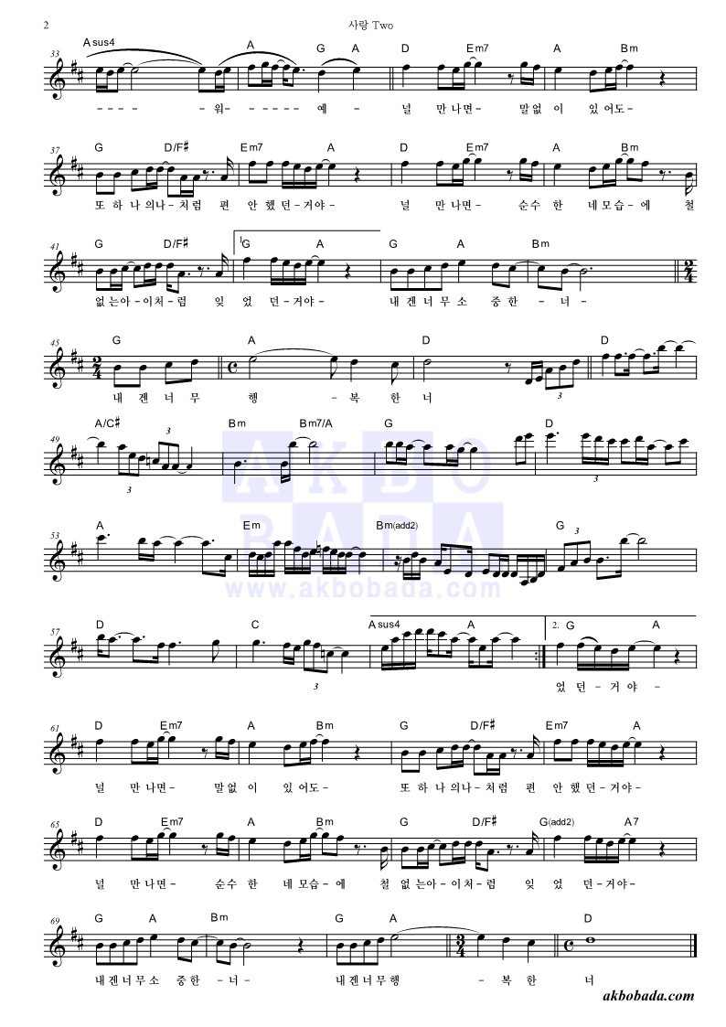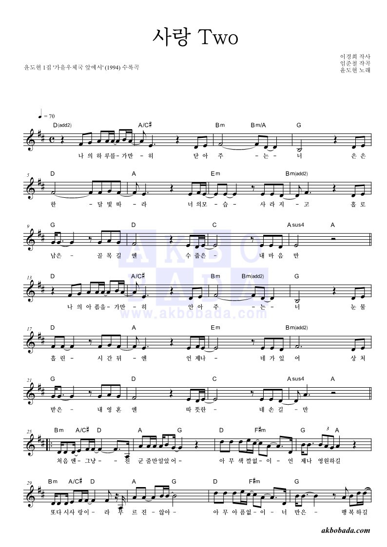 내가 선곡한 첫 곡은 윤도현의 《사랑TWO》이다. '악보바다'라는 웹사이트에서 결재하고 악보를 내려받아서 5부를 출력했다. 내가 볼 악보와 같이 수업을 듣는 분들께 전해 줄 악보이다. 전에는 악보를 구매한다는 생각을 못 했는데, 저작권 보호를 위해서라도 이렇게 유료로 이용하는 것이 바람직할 것 같다.