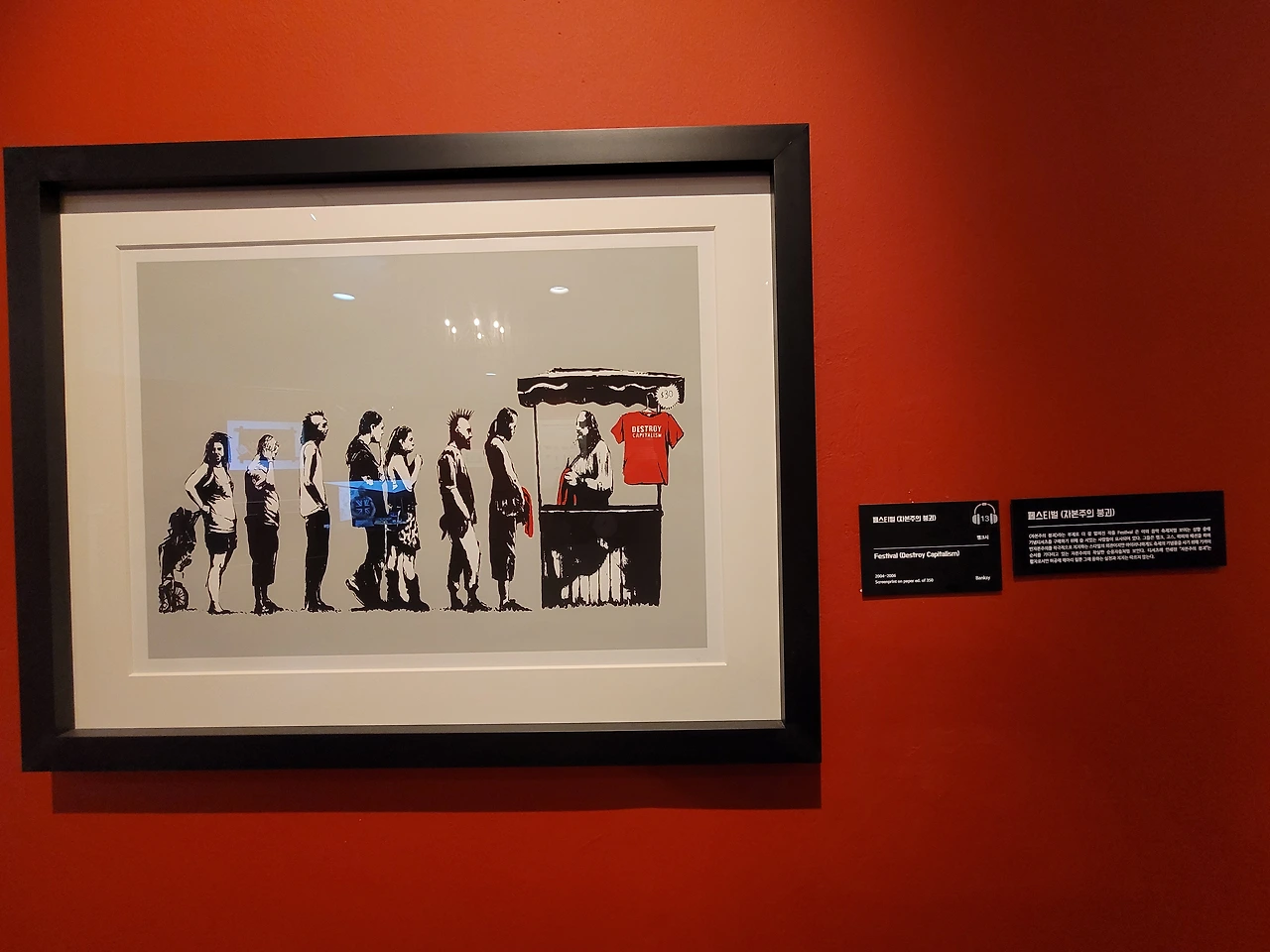 《Festival》에서는 뱅크시가 자본주의에 대해 메시지를 던지고 있다. 이 작품은 ‘자본주의 붕괴’라는 부제로 더 잘 알려져 있으며, 자본주의에 대한 사람들의 모순을 나타냈다. 축제기념품을 사기 위해 사람들이 줄을 서 있다. 그런데, 축제기념품인 빨간색 티셔츠에는 ‘자본주의 붕괴(Destroy Capitalism)’라고 쓰여있고, 사람들은 펑크, 고스, 히피의 패션을 하고 있다. 즉, 자본주의에 반항하는 모습으로 자본주의에 순응하고 있는 사람들을 통해 뱅크시의 자본주의에 관한 생각을 엿볼 수 있다.