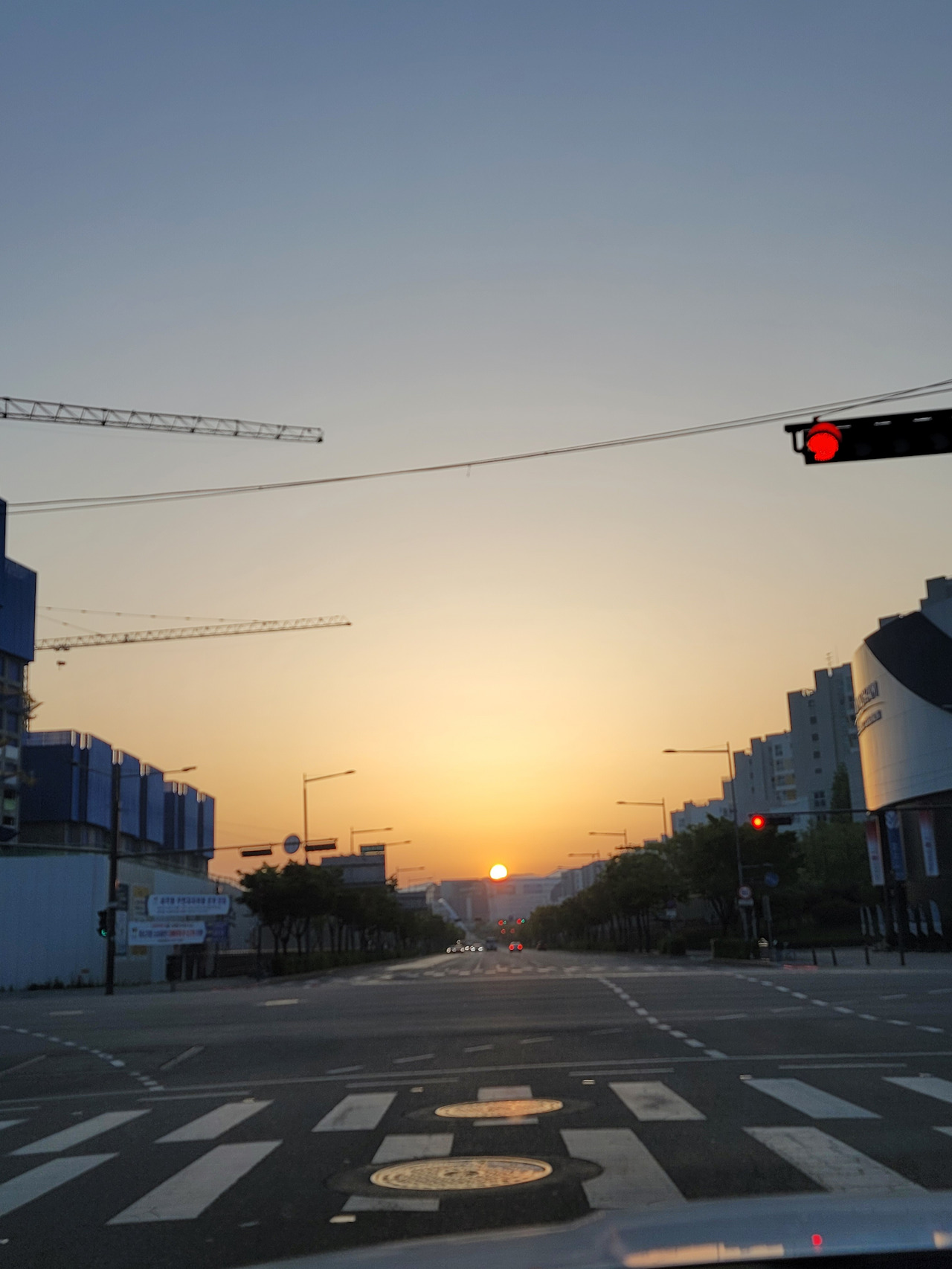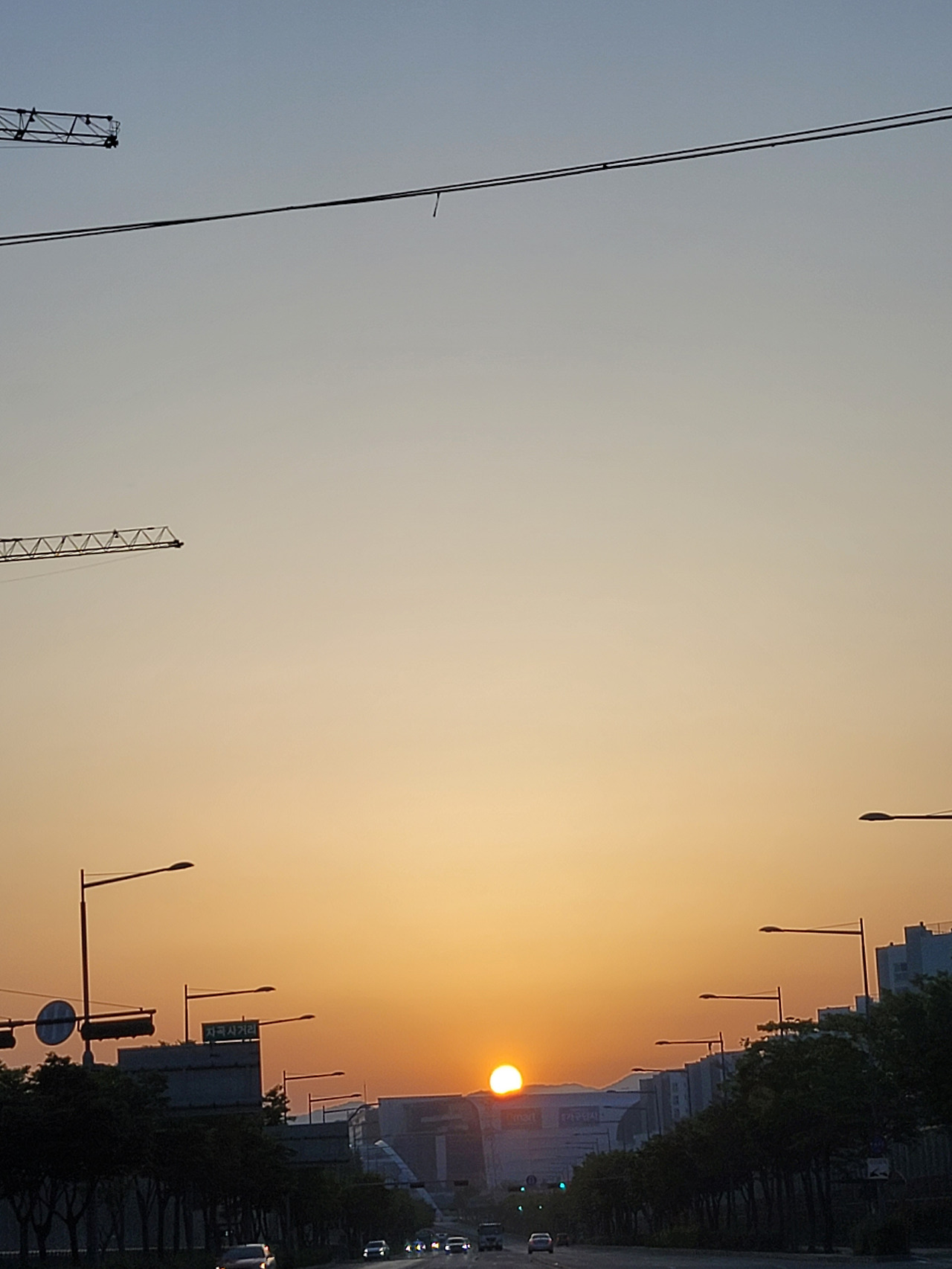 새벽에 운전하고 가던 중 사거리에서 신호 기다리다 태양이 떠오르는 것을 보았다. 그 순간의 그림이 너무 멋져서 사진을 찍었다. 도심이라서 그런지 가로등과 건물, 공사장의 크레인 등이 사진에 담겼다. 너무 아쉬워서 카메라 줌으로 좀 더 당겨서 다시 찍었다. 사진에서 다른 사물들이 많이 사라져서 나아지긴 했지만, 여전히 아쉬움이 남는다.
