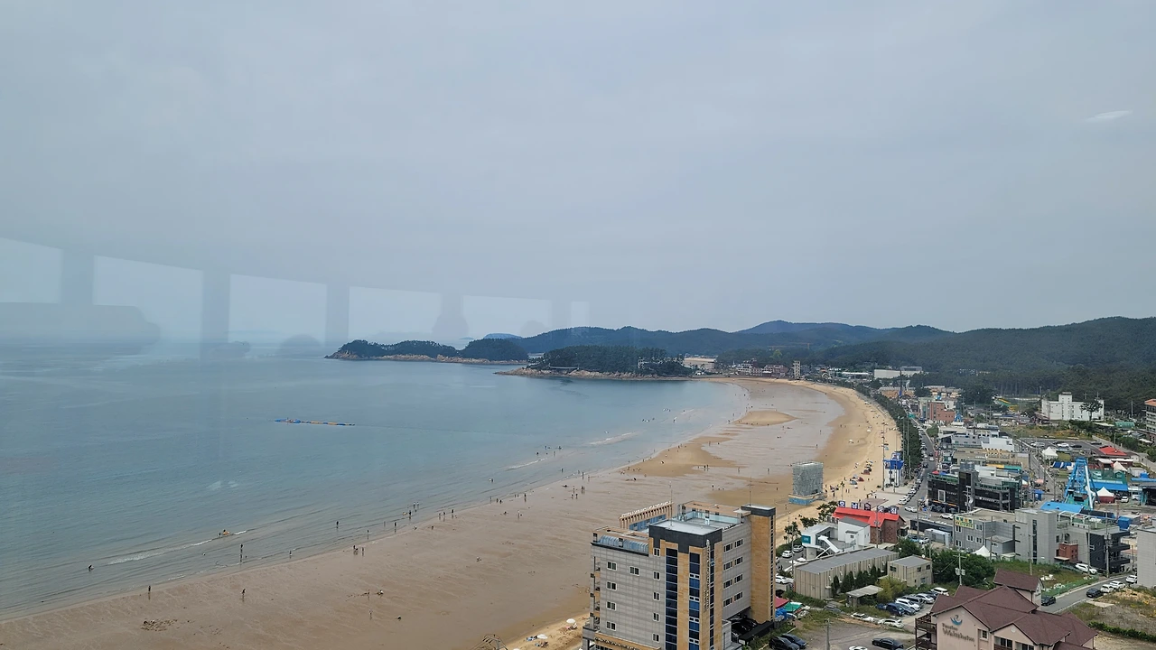 점심을 배부르게 먹은 후 만리포 전망대에 올라갔다. 식당에서 멀지 않은 곳에 위치해 있어 산책삼아 걷다 보니 전망대 입구에 다다랐다. 전망대는 아파트 13층 정도 되는 높이에 있어 엘리베이터를 타고 올라 가야만 했다. 다행히 올라가려는 사람이 적어서 기다리지 않고 금방 엘리베이터를 탈 수 있었다. 엘리베이터는 눈 깜짝할 사이에 전망대 앞에 멈췄다. 전망대에서 바라본 만리포 해수욕장 전경은 "와~"라는 탄성이 절로 나올 정도로 멋졌다. 우리도 그랬지만 전망대에 올라오는 모든 사람들의 첫마디는 우리와 같은 탄성이었다. 놀라운 건 이 전망대 이용이 공짜였다. 돈을 받더라도 사람들이 몰릴 것 같았는데 무료인게 더 좋았다.