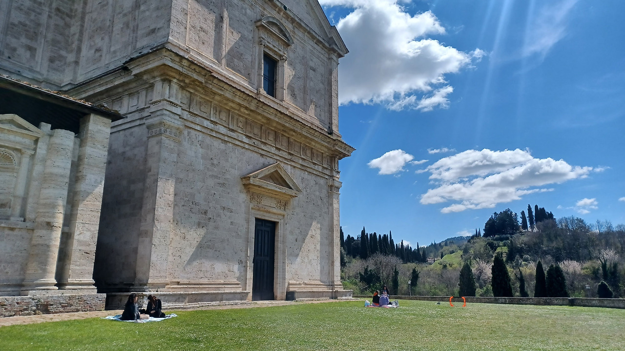천천히 광장을 중심으로 여기저기 구경하다가, 주차장아래로 바로 보였던 San Biagio 성당으로 향했다. 길은 엄청나게 가파른 내리막이었다. "아 여기 어떻게 다시 올라오지?" 라는 생각에 눈물이 날 때쯤 사이프러스 나무들과 파란 하늘, 그리고 지금이 왜 12시가 아니고 오후 1시 30분인지 섭섭할 정도로 예쁜 교회 종소리가 울렸다. 이 성당은 뷰맛집이었고, 성당 주변으로 잔디밭이 넓게 펼쳐져 있었다. 동네 사람들은 이미 이 곳을 잘 알고 있는 듯, 돗자리들을 챙겨와서, 샌드위치를 먹으며 소풍을 즐겼고, 뭣 모르는 관광객들은 돗자리 핀 동네 사람들을 부러워하며 여기저기 담벼락에 앉아서 멋진 풍경을 감상했다.