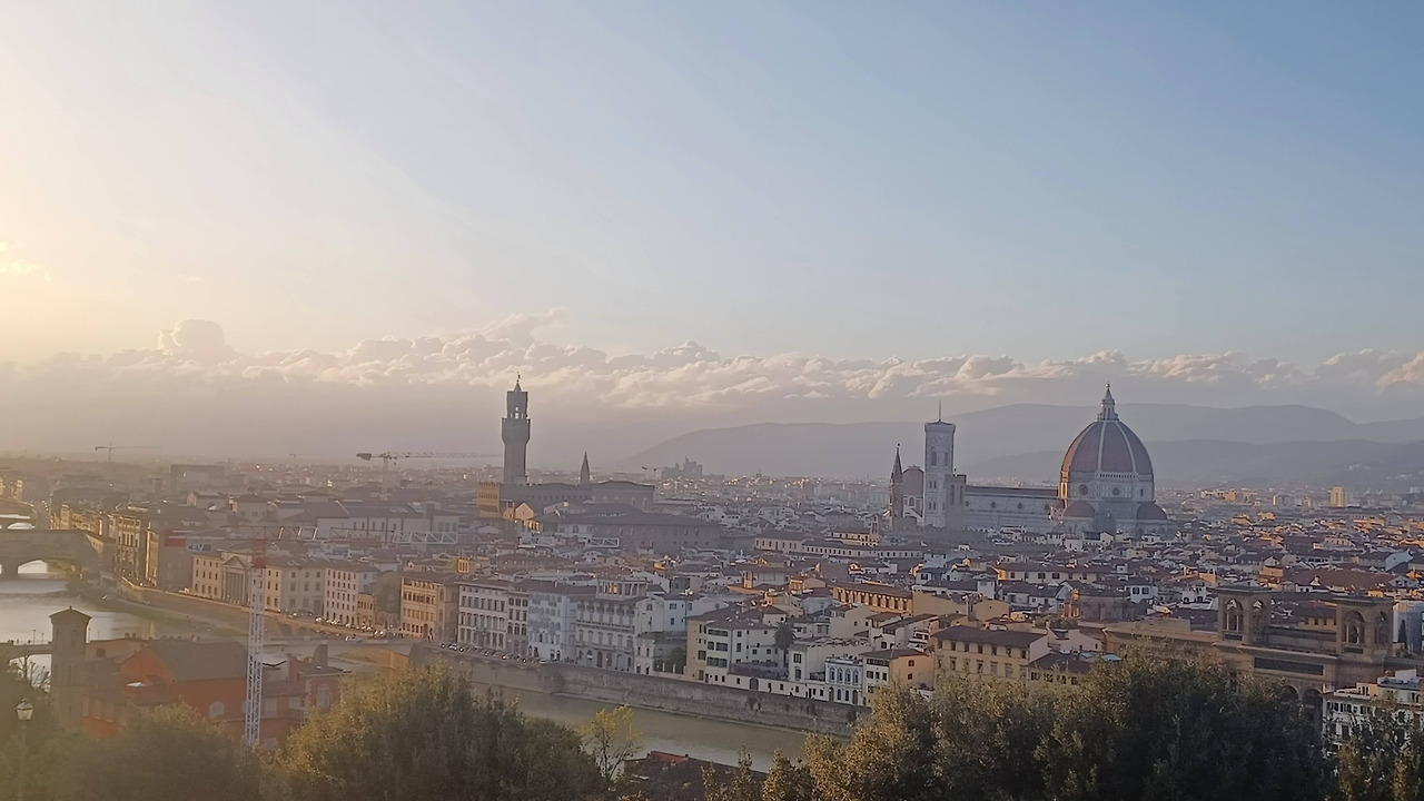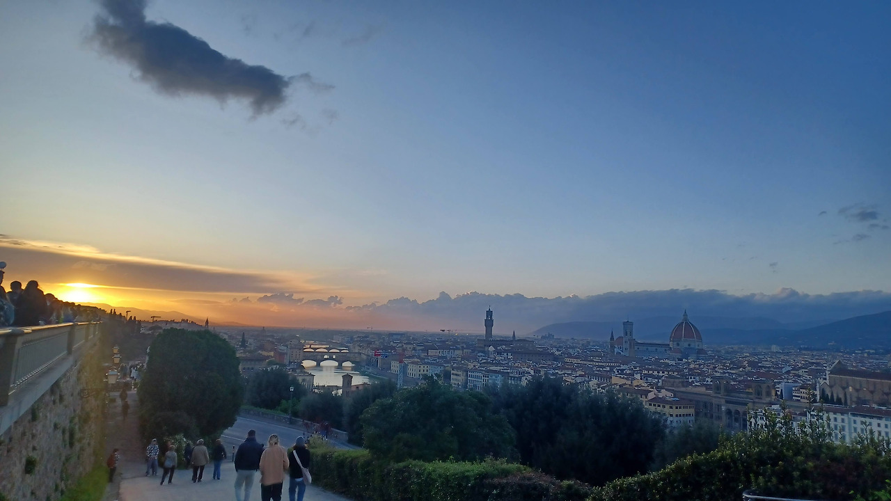 구름이 많아서, 흔히 기대하는 아름다운 석양은 아니었지만, 뽈록 튀어나온 귀여운 두오모, 시청건물, 아르보강, 베키오 다리, 예쁜 구름... 아.. 이 모든 것을 온전히 감상하기에는 다리가 너무 아팠다. 미켈란젤로 광장에 해가 넘어갈 때쯤, 우리의 여행은 이제 극기훈련으로 변했다. 생각해 보면, 시에나에서 돌아다니다가 오는 길에 잔뜩 긴장하고 잘 못 잔 상태로, 아침 7시부터 밤 9시까지, 중간에 점심 먹을 때 빼고는 거의 계속 서 있었다.