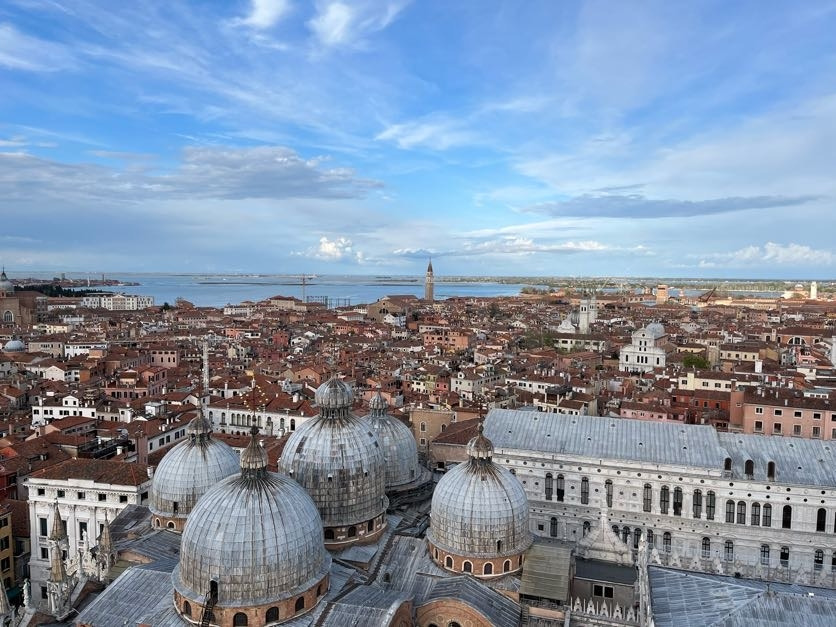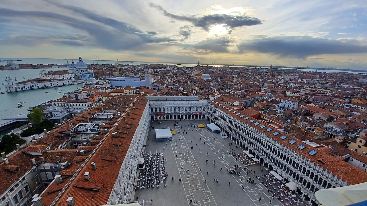 베니스의 골목은 토스카나나 피렌체와는 또 다른 매력이 있다. 그런데, 사람이 망쳐 놓은 것들이 좀 있다. 낙서는 그래도 정겨움이 있는데, 가끔 찌린내가 심한 골목들이 있다. 하여간 이 골목 저 골목, 이 광장 저 광장 굽이굽이 헤쳐서, 사람으로 가득찬 리알토 다리에서 "여기는 왜 유명할까" 에 대해서 토론을 하고, 드디어 산마르코 광장에 도착했다. (밖에서 걷기 시작하자, 절뚝이던 친구는 마치 은혜 입은 환자마냥 통통 뛰어다녔다.) 산마르코 성당은 이슬람 쪽의 양식이 결합된 금빛 비잔틴 양식이라던데 가까이서 보니 정말 화려했다. 시간이 늦어서 안으로 들어가 보진 못했지만, 한번쯤 들어가보고 싶은 호기심이 들었다. 원래 정말 가보고 싶었던 곳은 두칼레궁전이었는데 (무료입장이 없는 관광지가 좀 더 믿을만한 것 같다), 이건 다음 기회로 넘기기로 하고, 산마르코종탑으로 갔다. 이 종탑은 10유로 현장 구매로 엘리베이터를 타고 올라갈 수 있다. 걸어서 올라가는 게 아닌데다, 풍경도 그리 높다는 느낌이 안 들고 멀리 보여서, 고소공포증이 있어도 무리 없이 즐길 수 있다. 거리에 사람은 많긴 했지만, 종탑 대기자가 많은 건 아니라서, 별로 기다리지 않고 수월하게 종탑에 올라갔다. 여기가 우리 마지막 관광지라는 느낌에 마치 밥을 꼭꼭 씹어 먹듯이 경치를 꼭꼭 씹어 간직하려고 애썼다.