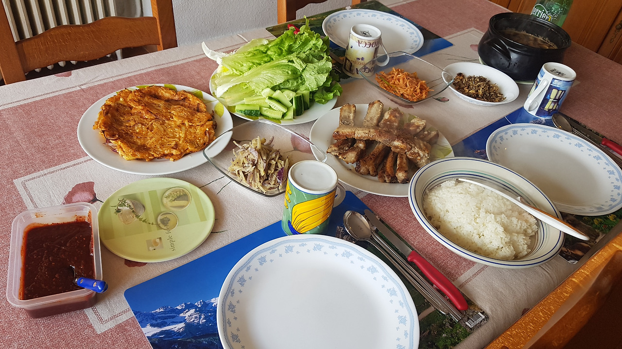 그렇게 완성된 감동의 집밥! 된장찌개, 김치전, 고기반찬에 각종 나물들, 무엇보다 매콤한 김치와 흰쌀밥! 한식으로 한상 가득 차려졌다. "우와, 우와" 감탄사만 나왔다. 한국 떠나온 지 일주일 만에 보는 한식에 눈물이 날 것 같았다. 함께 기도를 하고 밥을 크게 한 숟가락 '앙' 물고 된장찌개 국물을 떠먹었다. "캬~" 정말 눈물이 났다.