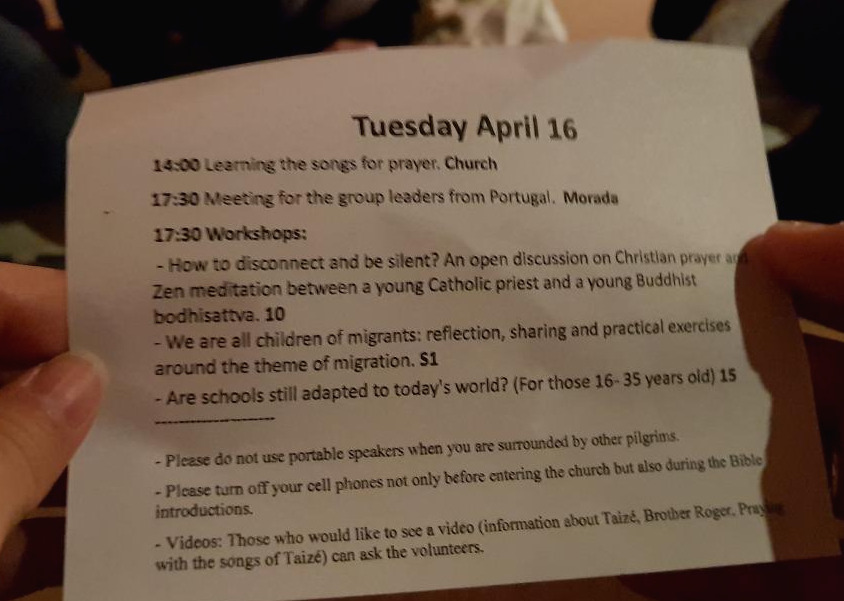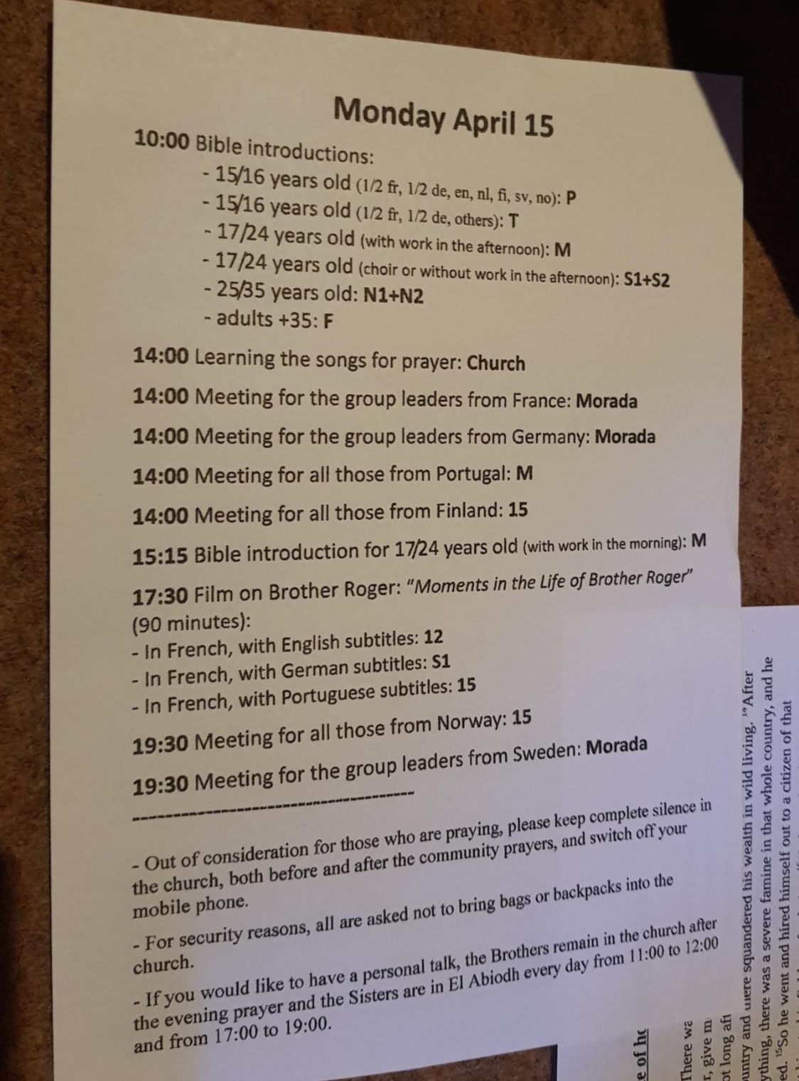 세계 곳곳에서 온 또래 친구들의 상황도 비슷했다. 나랑 동갑인 세라는 병원에서 방사선 치료사로 일했다고 한다. 다니던 병원을 그만두고 떼제에 왔으며, 떼제를 시작으로 6개월간 아프리카 등지를 여행하고 캐나다로 돌아갈 거라고 했다. 독일에서 선생님 겸 빅사이즈 모델로 활동하고 있는 키야는 오래 만나던 사람과 결혼까지 고민하다가 헤어지고 떼제를 찾았다. 키야의 부모님도 떼제에서 만나 결혼하셨다. 스페인 바르셀로나에서 온 마리아는 패션 디자이너로 이탈리아에서 일했다. 그녀는 업계의 불합리함을 못 견디고 고향으로 돌아와 초등학교 보육교사로 일하고 있다고 했다.