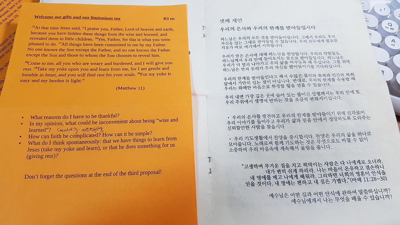 나도 깁스를 하고 여기까지 온 길에 대해 말했다. 두려움을 이기고 자존심을 내려놓고 도움의 손길을 받아들이는 법, '감사하게 받는 법'을 배우고 있는 것 같다고 했다. 이건 자연스럽게 세 번째 주제와 연결됐다. 마태오복음(Matthew 11.25-30)의 'Welcome our gifts and our limitations too(우리의 은사와 우리의 한계를 받아들입시다)'였다.