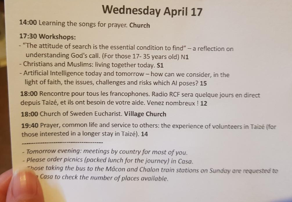 밥을 먹고 나면 매번 이렇게 즉흥 공연이 펼쳐졌다. 내 첫 떼제 생활을 이 독일 가족과 함께 할 수 있던 건 행운이었다. 하프를 연주하는 엄마와, 클라리넷을 부는 경찰 아들, 기타를 치는 아버지가 함께 떼제에서 부활을 맞기 위해 캠핑카를 끌고 왔다고 했다. 이 가족의 연주가 시작되면 사람들은 음악에 맞춰 춤을 추거나, 노래로 참여하거나, 박수를 치거나 각자의 방식으로 호응을 했다. 덕분에 매 식사시간은 천국이 되었다.