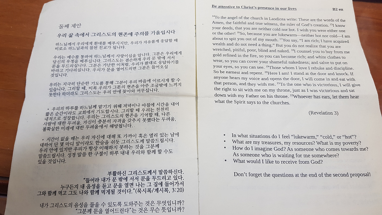 둘째 날, 화요일의 주제는 'Be attentive to Christ's presence in our lives(우리 삶 속에서 그리스도의 현존에 주의를 기울입시다)'였다. 요한 묵시록 3장 '라오디케이아 신자들에게 보내는 말씀(Revelation 3.14-22)'를 읽고는 'lukewarm(차지도 뜨겁지도 않음)'에 대한 열띤 토론이 있었다.
