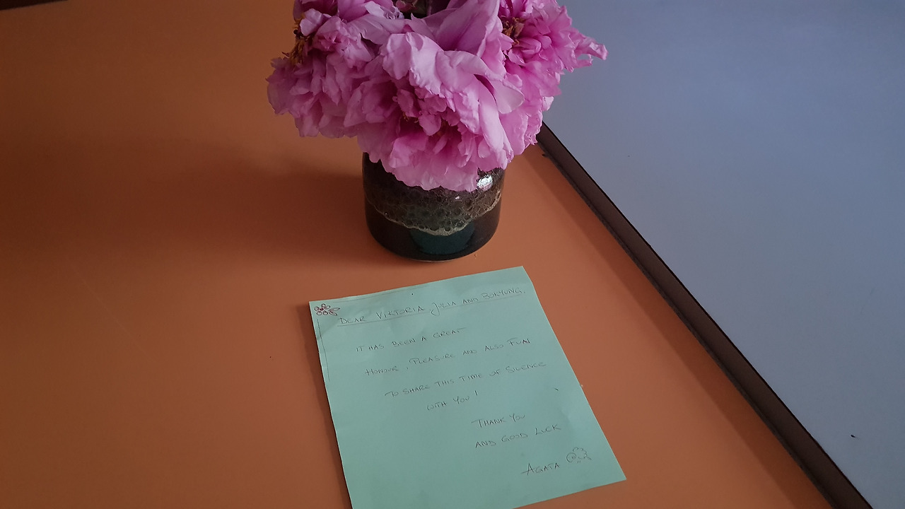 고양이와 장난을 치는데 익숙한 얼굴이 보인다. 폴란드 아가타였다. 처음 만났던 그날처럼 백발이 섞인 긴 생머리에 보라색 외투, 빨간색 캐리어를 끌며 걸어왔다. 아가타는 월요일부터 금요일까지만 함께 한다고 했었다. 마지막 인사도 못할 뻔했는데 다행이고 감사할 일이었다. 곧 또 만날 것처럼 포옹을 하고 함께 버스를 탔다. 둘 다 눈에 눈물이 고인 채로 씩 서로 웃었다. 말 안 해도 다 안다는 듯이.