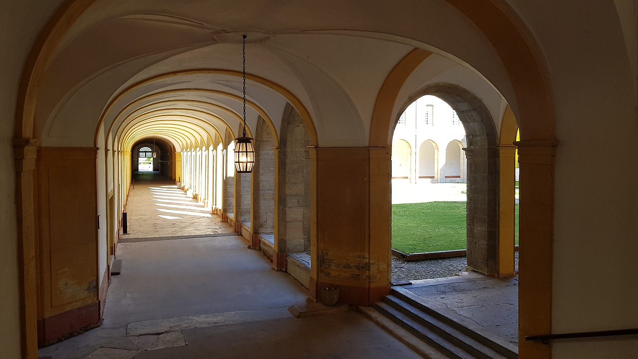 잔디정원을 둘러싸고 있는 둥근 아치와 수도사들의 수많은 방들이 있는 회랑을 지나 넓은 안뜰로 향했다.