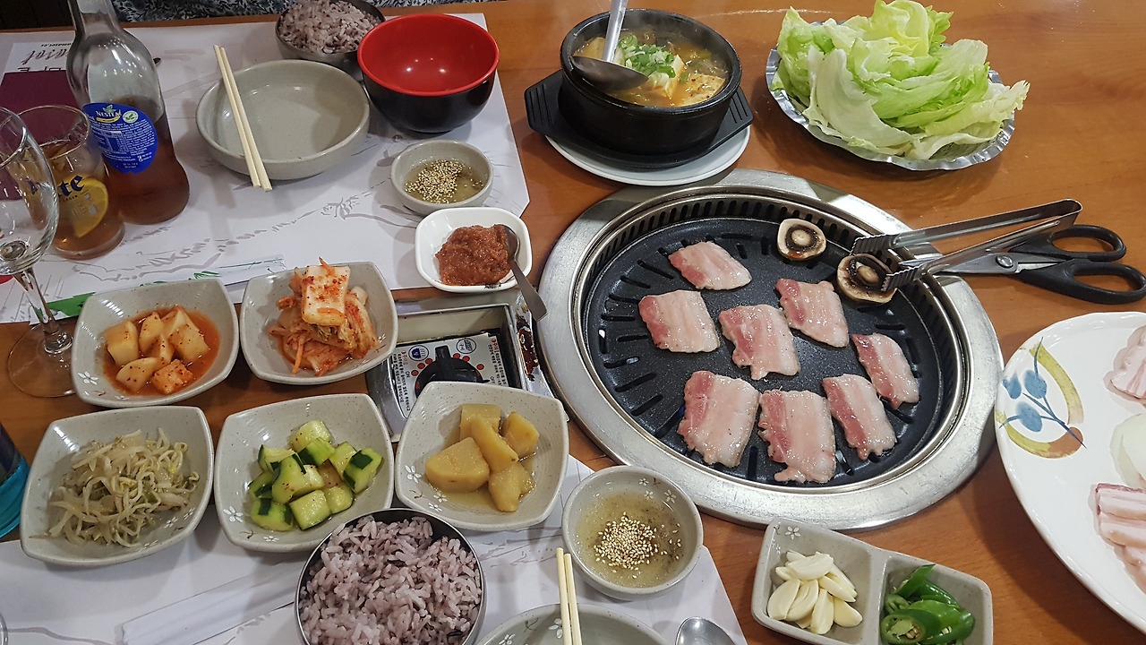 삼겹살, 송이버섯, 양파를 불판에 직접 구워 먹는 요리법과 노릇노릇 구운 삼겹살을 상추에 쌈장과 함께 싸 먹는 걸 보더니 마리아는 '펄펙또~!'를 외치며 정말 좋아했다. 올해 자기 생일파티는 여기서 하겠다며 아직 여러 날 남은 예약까지 했다. 주인 아주머니는 마리아와 나의 통역사 역할을 하며 빠르게 사라져 가는 밑반찬을 리필해주셨다. 삼겹살 한입, 밥 한입, 뜨끈한 된장찌개 한입이 '입 안에서 춤을 추면서 조화를 이룬다'는 마리아의 맛 평가와 함께 만찬을 즐겼다. 역시 음식은 맛으로만 먹는 게 아니라는 것을 느꼈던 시간이다.