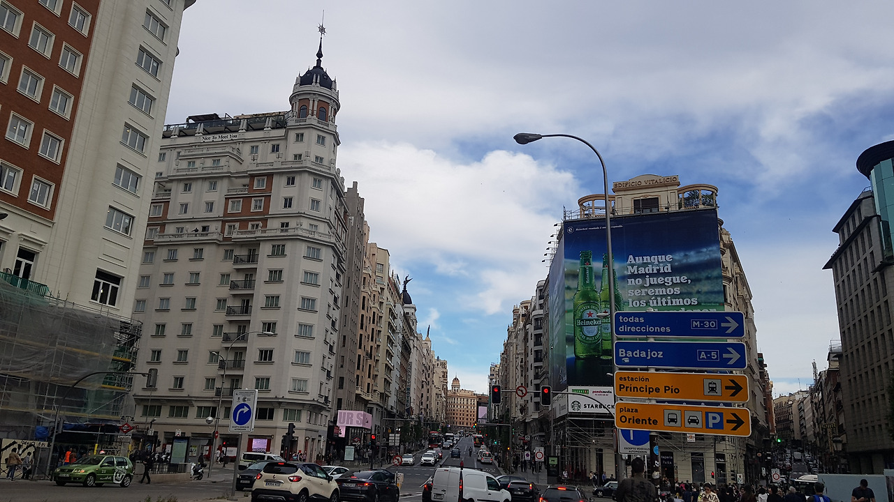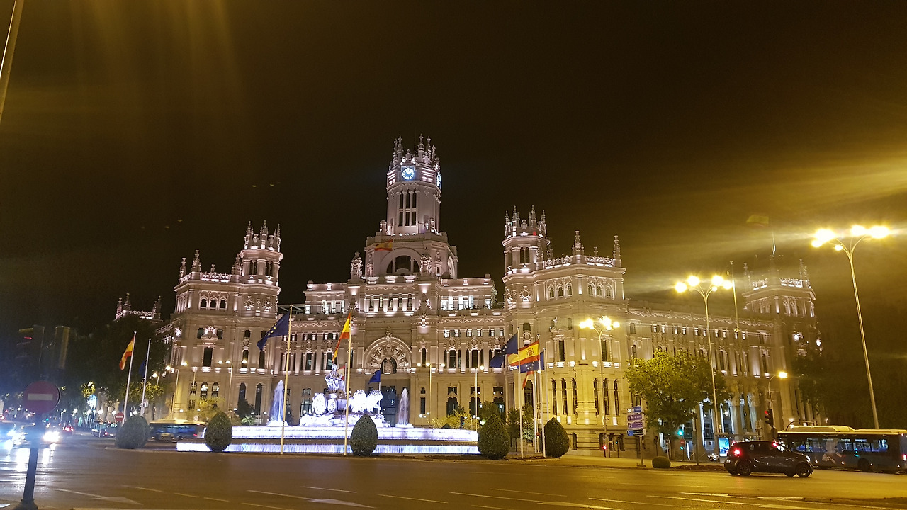 건너편의 빛나는 건물은 스페인 은행(Bank of Spain), 이곳을 지나면 화려한 메트로폴리스(Metropolis) 빌딩이 보인다. 보험회사 건물로 20세기에 지어졌다고 한다. 밤거리는 조명으로 새하얗게 빛났지만 솔 광장이나 시벨레스광장 부근 이외의 장소들은 문 닫힌 회사 건물들 뿐, 걸어 다니는 사람들도 없어서 좀 무서웠다.