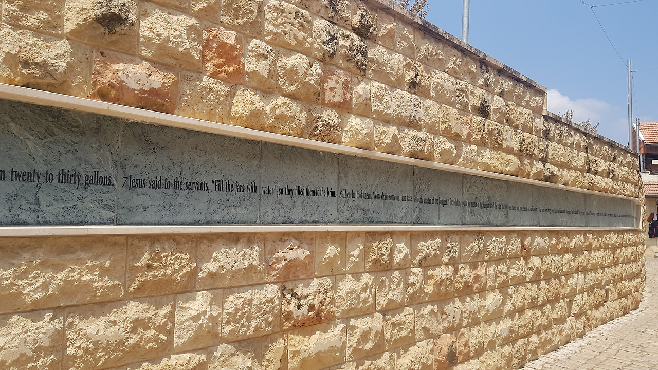 두 갈래 길에서 한 곳을 따라 위로 올라가면 카나의 혼인잔치 기념성당을 알려주는 사인이 보였다. 성당까지 이어지는 긴 벽에는 성경의 '카나의 혼인잔치' 성경 말씀이 적혀있었다.