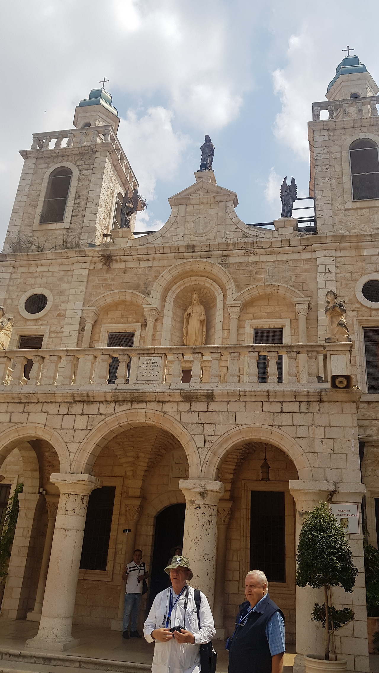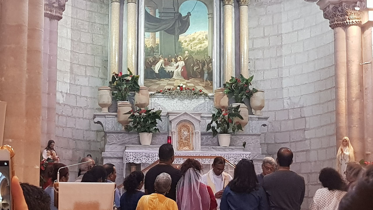 카나의 혼인잔치에서 예수님이 물을 포도주로 변화시킨 첫 기적을 일으키신 만큼, 이곳 성당을 방문한 부부들은 혼인 갱신식을 한단다. 우리 순례단에도 한 커플이 있어서 모두 예수님과 성모님처럼 카나의 혼인잔치에 초대될 수 있었다. 앞에 예식을 마친 분이 베일과 화관, 부케까지 기쁜 마음으로 넘겨주는 작은 기적까지 마련되었다. 혼인성사에서처럼 주례 사제 앞에서 반지를 교환하고 예식을 치르는 부부를 보면서 참 예쁘다는 생각이 들었다. 아직 결혼도 안 했는데 '꼭 여기 와서 나도 혼인 갱신식 해야지'하는 마음도 생겼다. 우리 순례단 모두를 성경 속으로 초대해준 신기하고 감사한 시간을 기념하며 다 함께 '이 시간 너의 맘속에' 율찬을 축가로 대신했다. 결혼식 대형으로 자리를 잡고 기념사진을 남긴 후 짧은 개인 시간이 주어졌다.