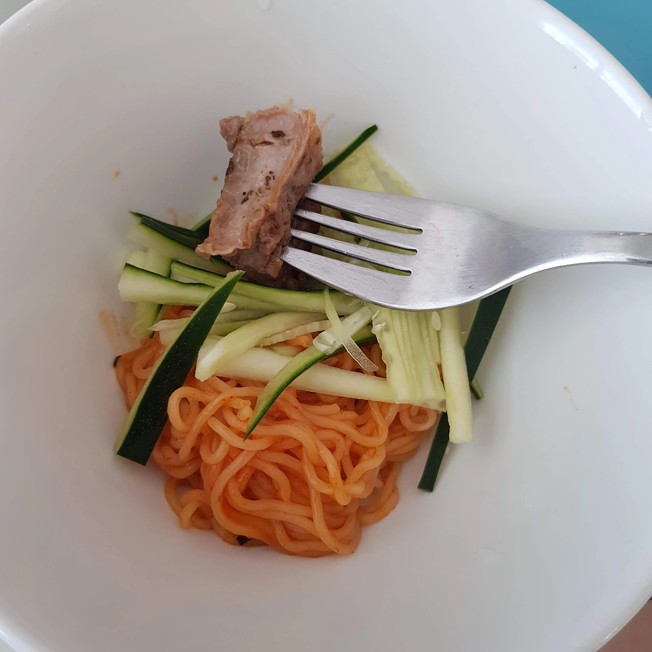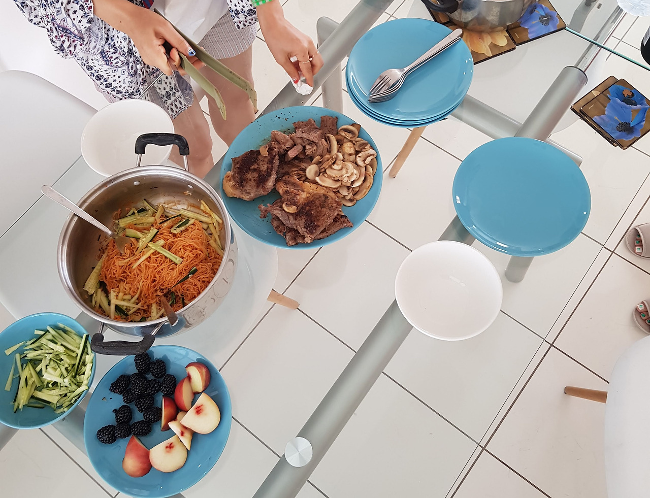 새벽까지 신나게 놀다 온 우리들은 해가 중천에 떠서야 하나 둘 일어나기 시작했다. 두시가 넘어 먹는 첫끼는 스테이크가 올라간 비빔면이었다. 요리를 즐기지 않지만 BTS의 팬인 P가 준비해 주었다. BTS가 해외 가면 즐겨 먹는 음식이라고 했다. 스페인의 납작 복숭아와 까바도 곁들였다. 주당 고객들을 위해 술은 그 이후로도 매끼마다 제공되었다. 아침부터 찐친과 모닝음주로 시작하는 이곳이 진정 파라다이스였다. 늘어지게 자다가 일어나고 싶을 때 일어나고, 식구들을 위한 밥도 차리지 않고, 날 귀찮게 하는 사람 아무도 없는 이 여유로운 아침, 아니 점심을 만끽했다.