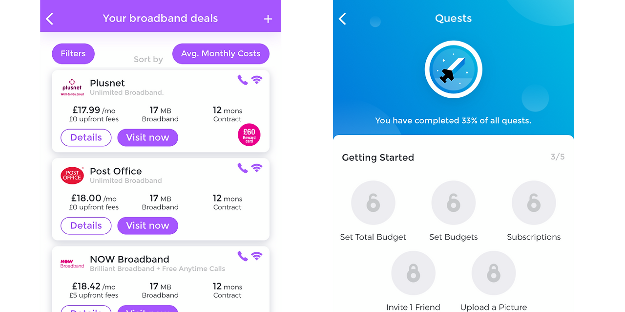 클레오가 대화가 가능한 나만의 돈 친구였다면, 엠마는 최근에 본 친구 중에 젤 스마트한 친구이다. 우선 계좌를 뒤져서 내 월급 내역을 찾아내서 내 월급이 맞냐고 물어본다. 그리고 자동 이체 내역을 찾아서 평균보다 높으면 알려준다. 이게 참 유용한데, 영국은 가스, 통신 서비스 업체들이 고객 몰래 돈을 올리는 경우가 많은데, 이 기능은 이를 방지해준다. 그리고 기존에 내가 사용하는 가스업체가 다른 업체보다 가격이 저렴할 경우 추천을 해주기도 한다. 매주 상금이 걸린 일반상식 퀴즈도 보내주기도 하고 퀘스트를 주고 이를 모두 풀면 포인트를 주는 재미있는 기능도 있다.