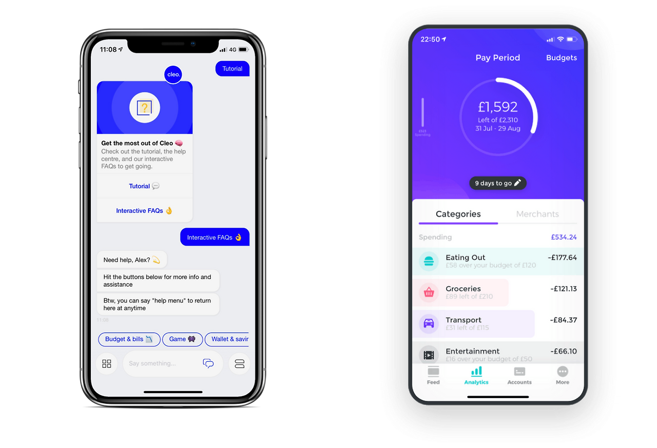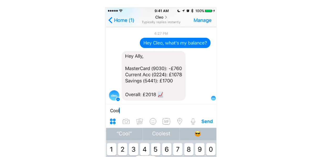 클레오, 이 친구의 태생은 페이스북 메신저이다. 지금은 네이티브 앱도 있지만 원래는 페이스북 메신저에서 나의 재정 상태에 대해서 대화를 나누던 친구였다. 내 은행 또는 신용카드를 연결하면, 매주 또는 이따금씩 페이스북 메신저로 말을 걸었다.
