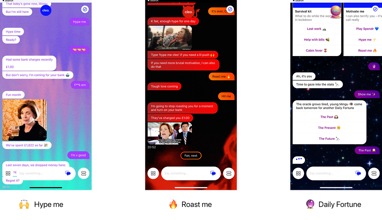 클레오는 메신저에서 앱으로 옮겨 타면서 갑자기 다중 인격체가 되어 버렸다. 여러 인격체가 있는데, Hype me mode는 격려 메시지를 보내주며 좋은 기운을 북돋아 준다. Roast me mode는 똑같은 내용을 기분 나쁘게 이야기해주어 나를 재정 상태를 꾸짖어 주고, Fortune mode는 나의 미래의 재정을 미리 예상해서 알려준다. 이밖에도 요다 모드, 다 부숴버리기 모드 Covid-19 도움 모드 등 다양한 모드가 있다. 나는 보통 기본 인격체만 사용하지만 가끔 재미 삼아 다른 인격체를 바꾸어보기도 한다.