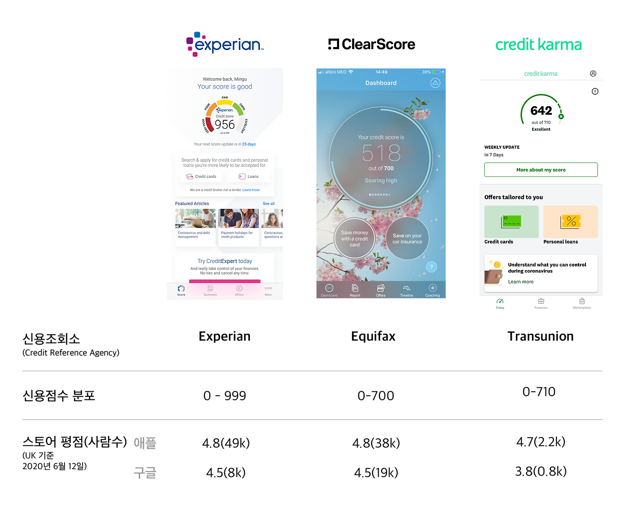 굳이 왜 세 개 앱을 설치해야 하는가에 대해 묻는다면, 우선 각각 다른 신용조회소에서 가져오며, 다른 점수제와 등급기준이 있다. 내가 앞으로 이용하게 될 은행이 어떤 조회소를 이용할지 모르기 때문에 용량만 괜찮다면 이 모든 앱을 설치하기를 권한다.