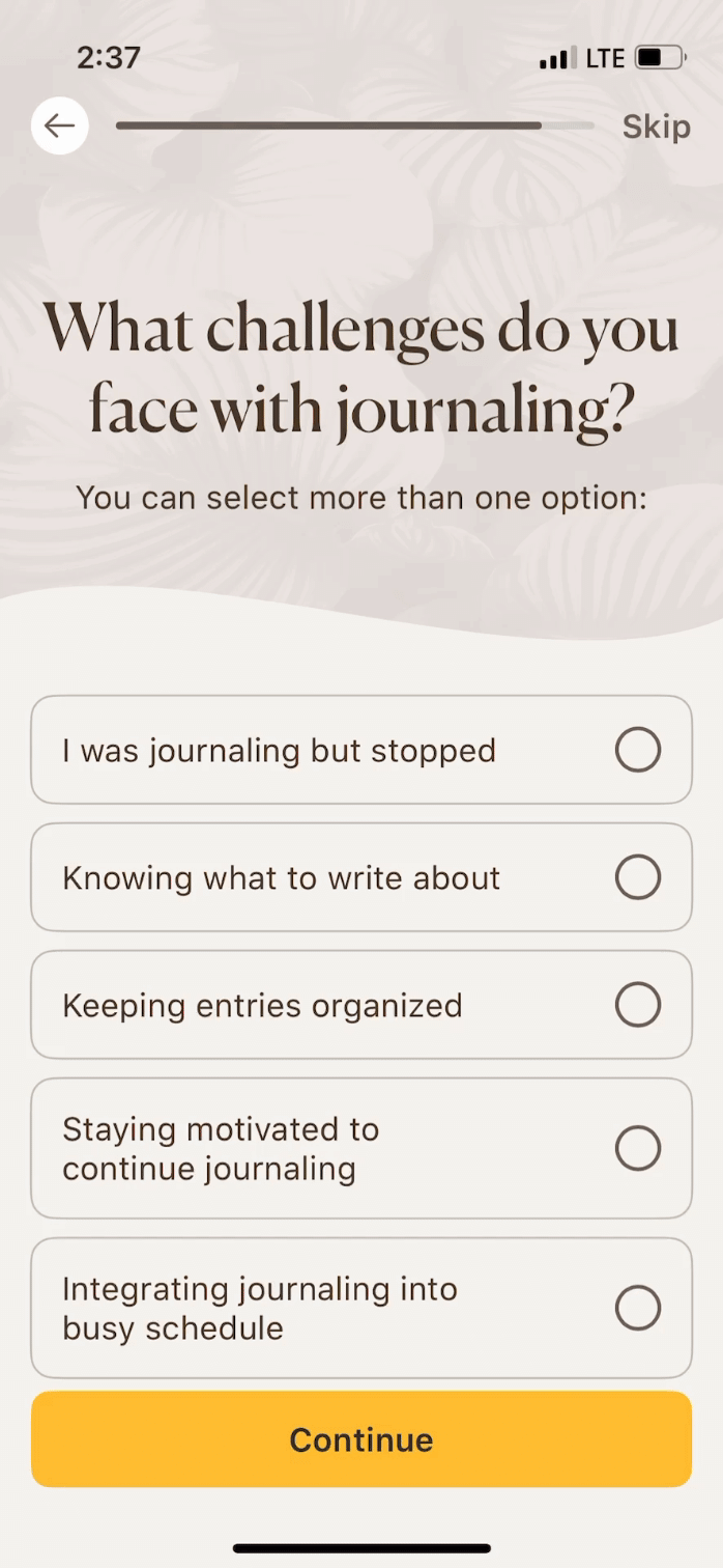 회원가입 단계 후 온보딩 단계에서 사용자에게 다양한 선택지를 주는 것이 좋았어요. 또한 국내 앱들은 대다수가 개인화 설정에서 선택지만 주어지는 UI가 보통인데 5 Minute Journal 은 중간 중간 설명을 넣어주어 좀 더 선택에 있어 몰입감을 주는 UX라고 느꼈어요. 아무래도 계속 질문과 선택만 하는 것이 아니라 중간 중간 간단하게 이 앱에 대한 가치를 설명해주면 더 신뢰감이 가기 때문이죠.
